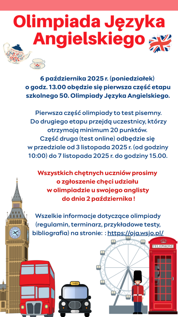 6 października 2025 r. (poniedziałek) o godz. 13.00 obędzie się pierwsza część etapu szkolnego (ETAP I) 50. Olimpiady Języka Angielskiego.