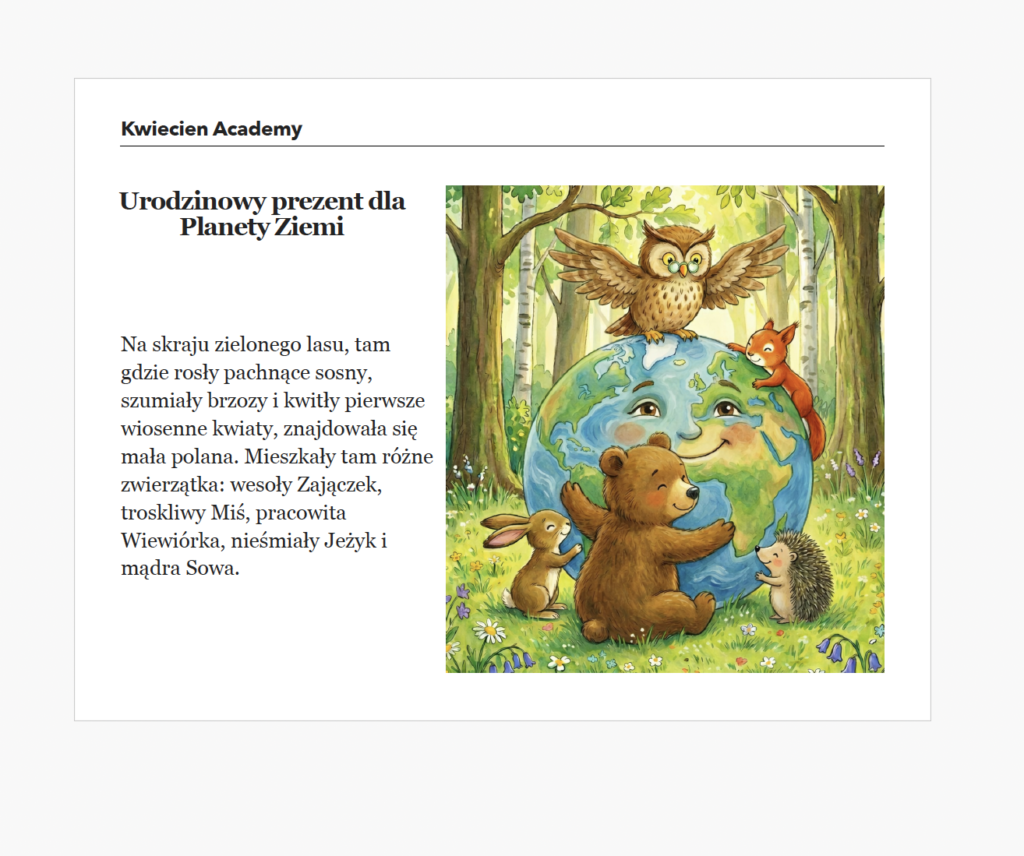 Gdy dziecko usłyszy historię o Ziemi, która płacze i czeka na prezent, i gdy samo napisze list dla Ziemi albo narysuje planetę pełną życia — coś w nim zmienia się na trwałe. Nie dlatego, iż dostało zadanie domowe. Dlatego, iż poczuło.