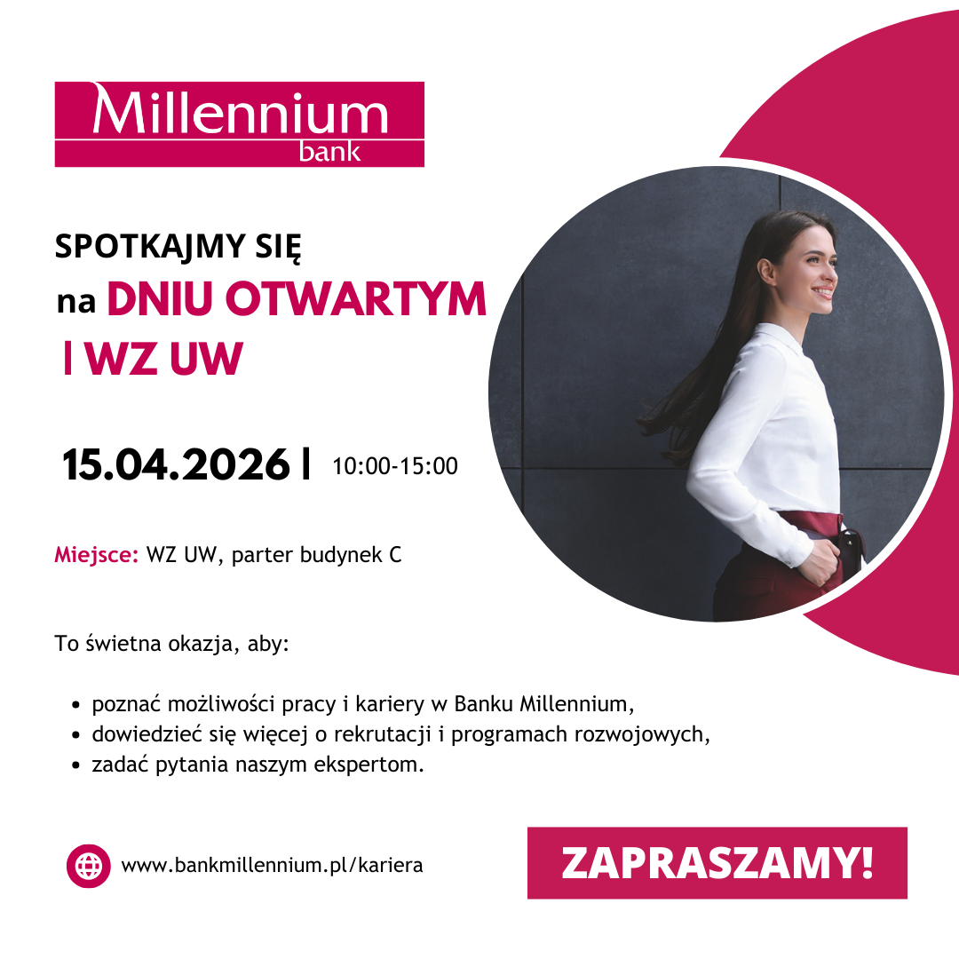 Już 15 kwietnia studenci i absolwenci Wydziału Zarządzani Uniwersytetu Warszawskiego będą mieli okazję spotkać się z przedstawicielami Banku Millennium podczas Dnia Otwartego, który odbędzie się na Wydziale Zarządzania UW. Wydarzenie zaplanowane jest w godzinach od 10:00 do 15:00 i stanowi doskonałą okazję do bliższego poznania jednego z wiodących banków w Polsce – zarówno jako instytucji finansowej, jak i atrakcyjnego pracodawcy.