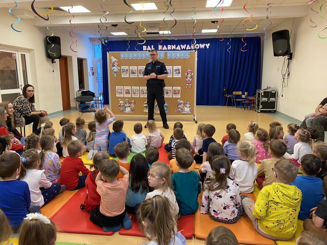 W trosce o bezpieczeństwo naszych przedszkolaków 14 stycznia odbyło się spotkanie z panem policjantem. Dzieci utrwaliły zasady bezpieczeństwa podczas uprawiania sportów zimowych i zabaw na świeżym powietrzu.