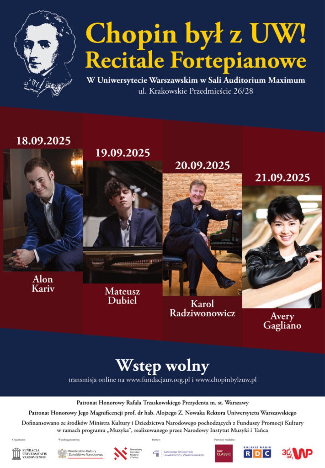 Recitale w ramach „Chopin był z UW!” wykonają wirtuozi fortepianu, zwycięzcy i laureaci konkursów pianistycznych: