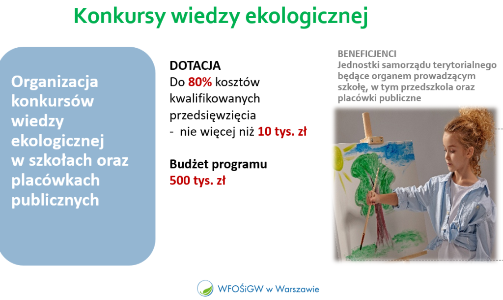 Wspiera organizację konkursów ekologicznych w szkołach i placówkach publicznych, których celem jest rozwijanie zainteresowań przyrodniczych, pogłębianie wiedzy o ochronie środowiska i kształtowanie postaw ekologicznych. To również szansa na integrację uczniów i inspirowanie do działania na rzecz środowiska.