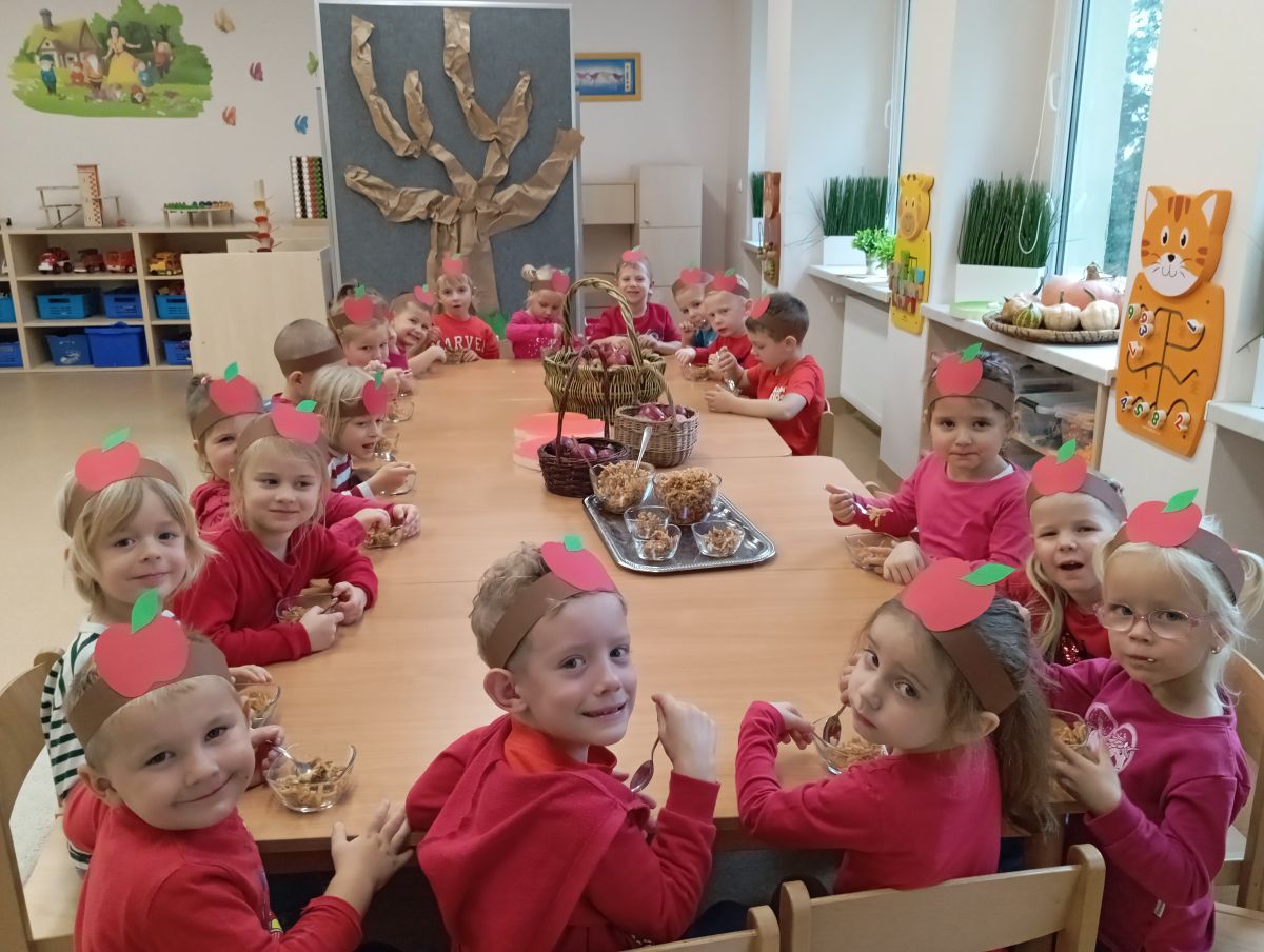 W poniedziałek, 06.10.25, nasza grupa obchodziła "Dzień Jabłka". Podczas wspólnych zabaw i aktywności Pszczółki ugruntowały wiedzę dotyczącą budowy jabłka, cyklu życia jabłoni a także dotyczącą jego walorów zdrowotnych i spożywczych.