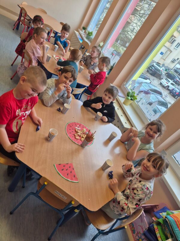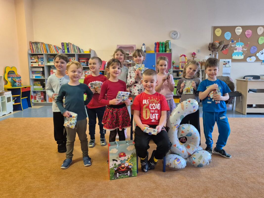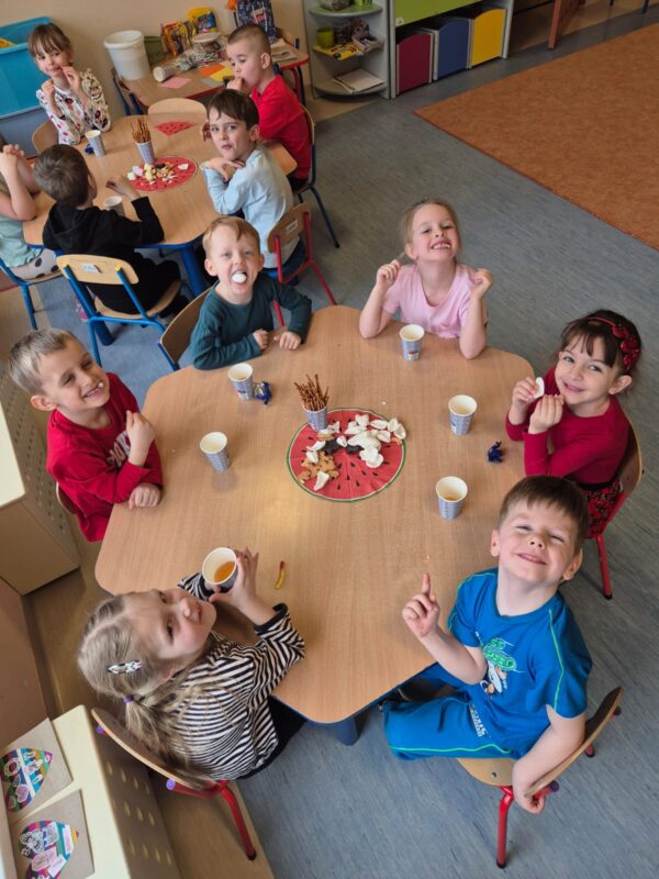 Ten tydzień w naszej grupie „Motylki” zakończyliśmy podwójnym świętowaniem. Dziś urodziny obchodził nasz Karolek – dzieci zaśpiewały mu radosne „Sto lat”, a słodki poczęstunek sprawił wszystkim mnóstwo radości. Jednocześnie świętowaliśmy Walentynki, czyli „święto miłości”. Była to doskonała okazja do rozmów o uczuciach i sposobach ich okazywania, a także do wzmacniania więzi między dziećmi oraz nauki współpracy w parach.
