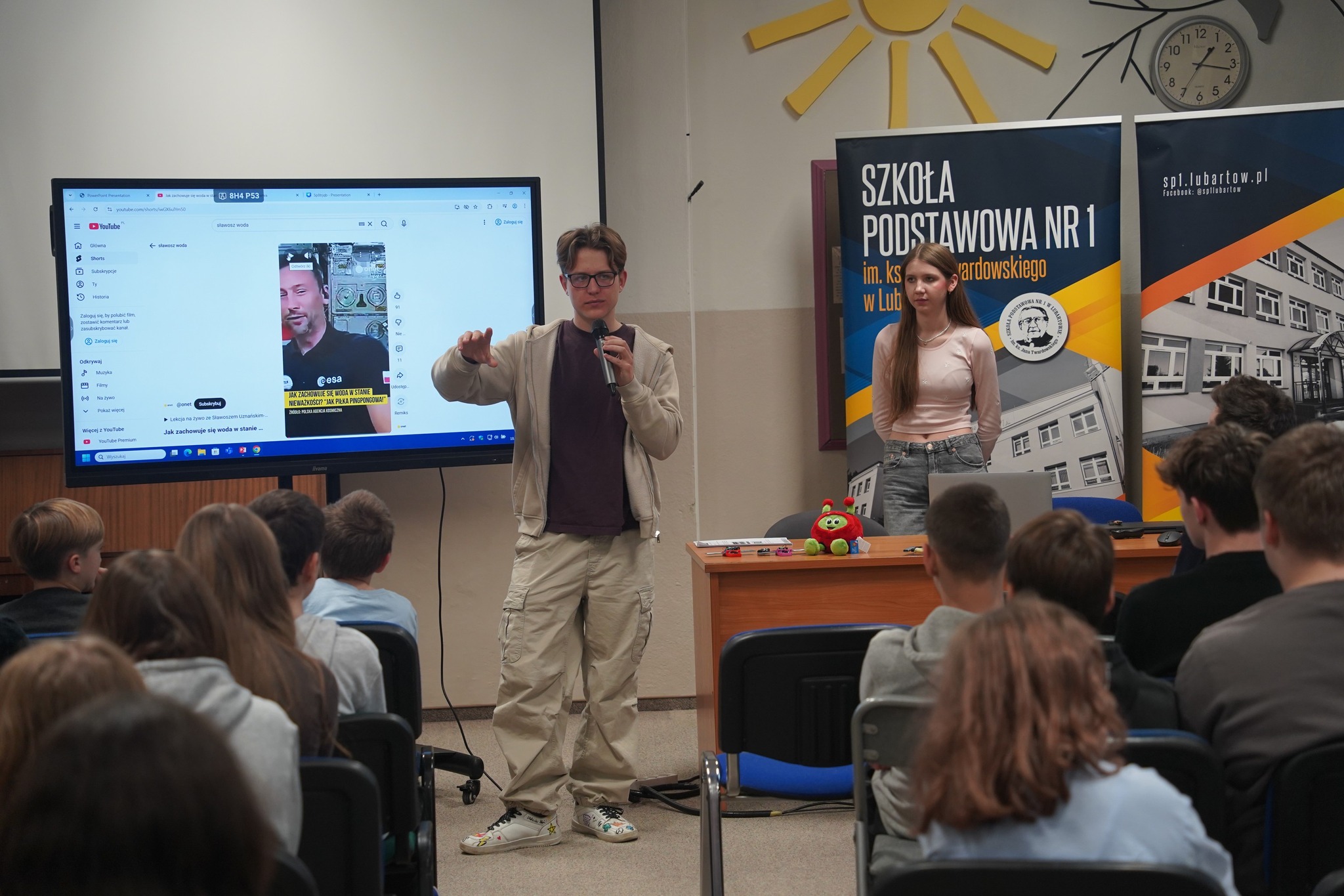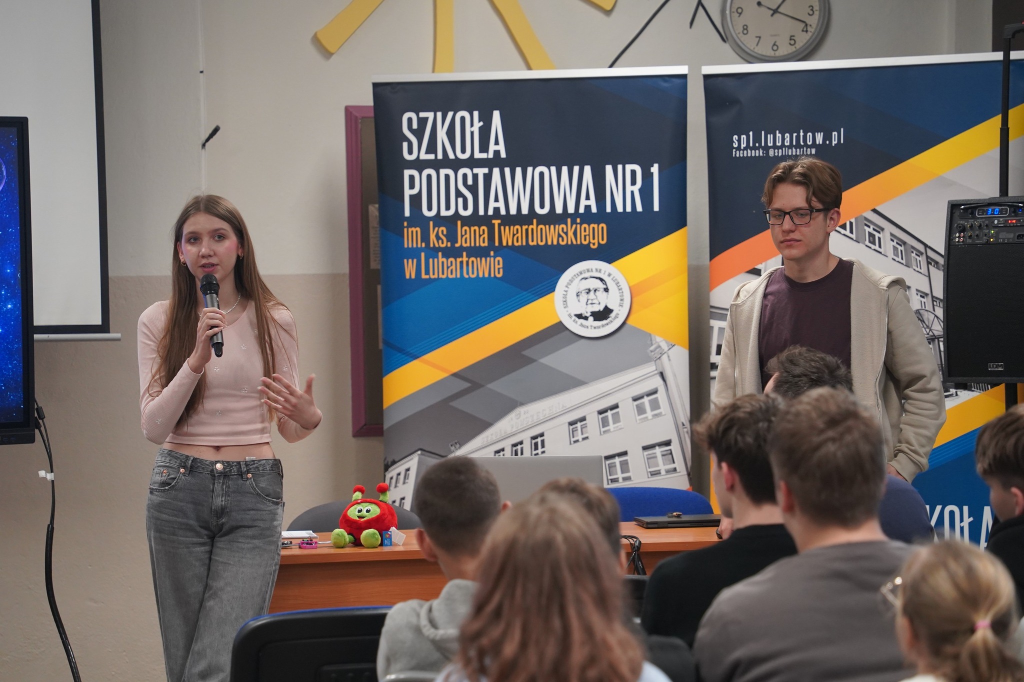 Niezwykli goście z II Liceum Ogólnokształcącego im. Piotra Firleja w Lubartowie, Natalia Rysiowska i Jan Lipski, przybliżyli uczniom Szkoły Podstawowej nr 1 im. ks. Jana Twardowskiego tajniki kosmosu podczas wydarzenia „Drogi do Kosmosu”. Pod opieką Jolanty Prokopowicz zaprezentowali eksperyment z bańkami mydlanymi, przeprowadzony wcześniej przez polskiego astronautę Sławosza Uznańskiego-Wiśniewskiego na Międzynarodowej Stacji Kosmicznej.
