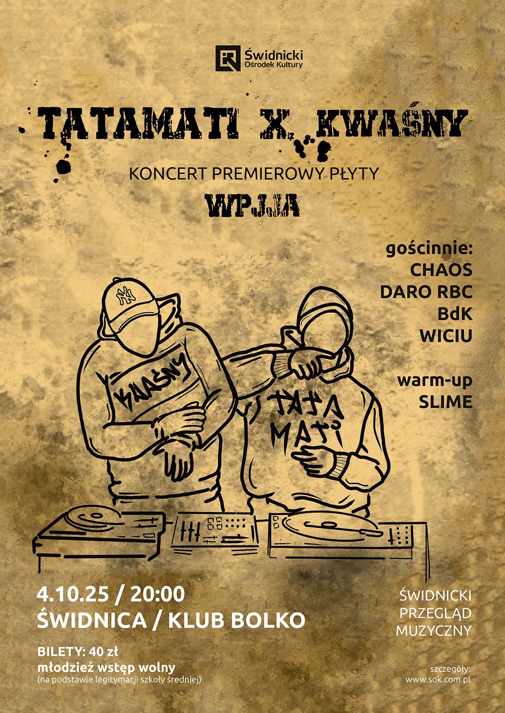 Świdnicki Ośrodek Kultury zaprasza w sobotę 4 października na wyjątkowy koncert w Klubie Bolko, podczas którego duet TataMati × Kwaśny zaprezentuje premierowo materiał z albumu „Wszystko Po Jestem Jest Afirmacją”.