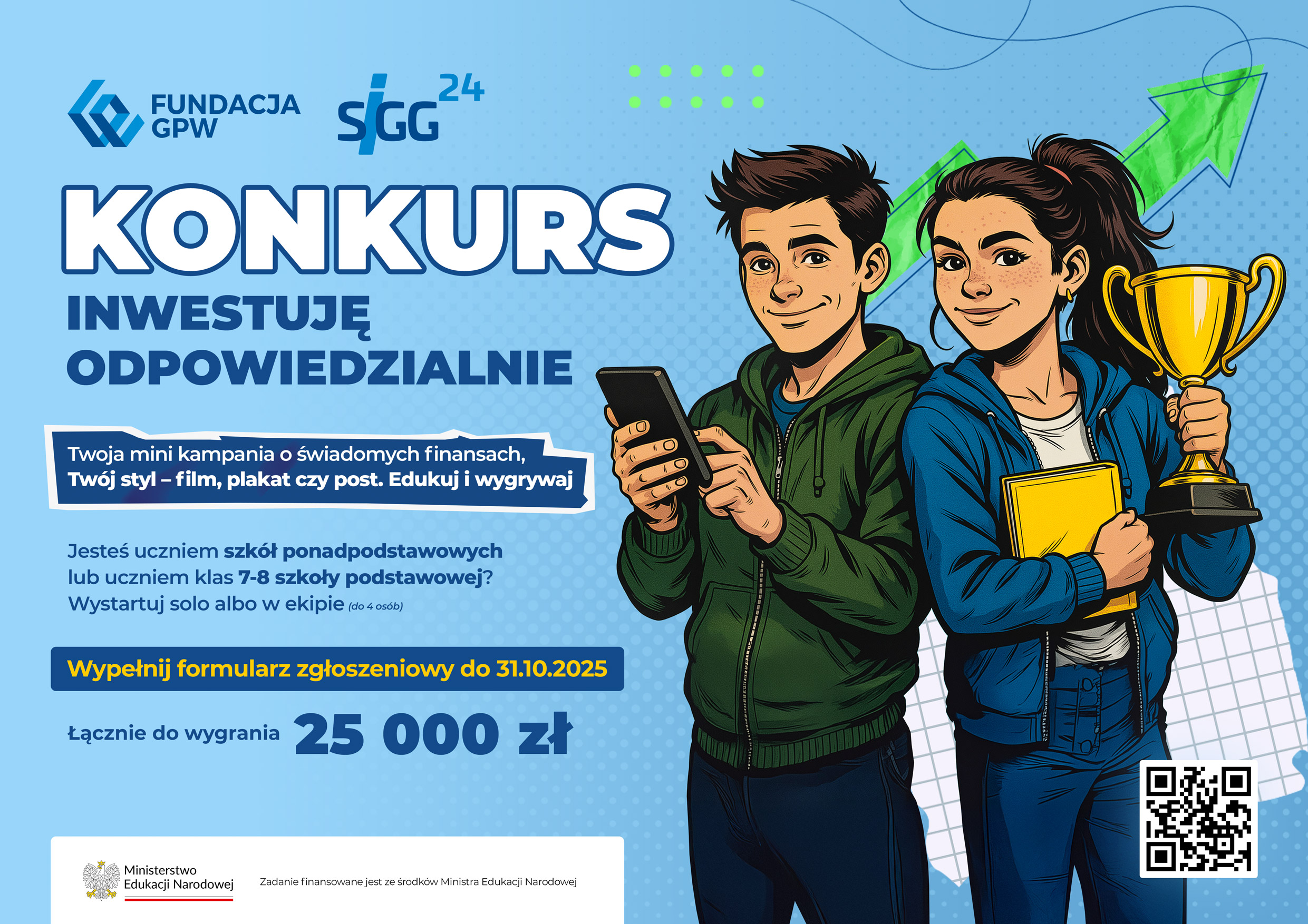 • Konkurs „Inwestuję Odpowiedzialnie” – polega na przygotowaniu przez uczniów mini kampanii edukacyjnej dotyczącej odpowiedzialnego inwestowania, podejmowania decyzji finansowych czy rozpoznawania dezinformacji. Do wyboru są trzy formy: krótki film wideo (1–2 min), plakat lub grafika, post do mediów społecznościowych. Prace można przygotować indywidualnie lub w zespołach 2–4 osobowych. Termin nadsyłania zgłoszeń upływa 31 października 2025 r.