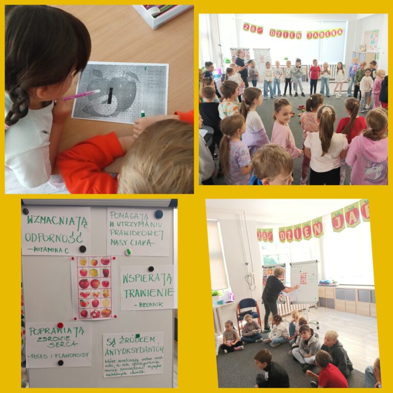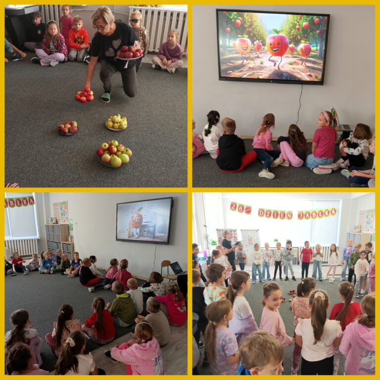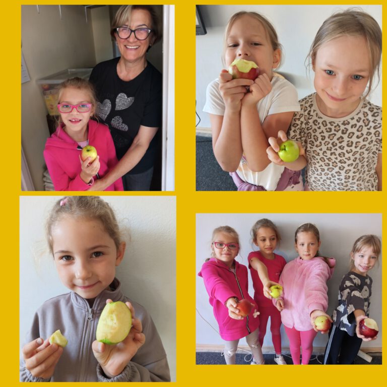 Podczas zajęć świetlicowych dzieci poznały zalety spożywania jabłek. Dowiedziały się ile kalorii zawiera jabłko, poznały różne gatunki jabłek – miały okazję je popróbować, a także wyliczały zastosowanie jabłka w kuchni.