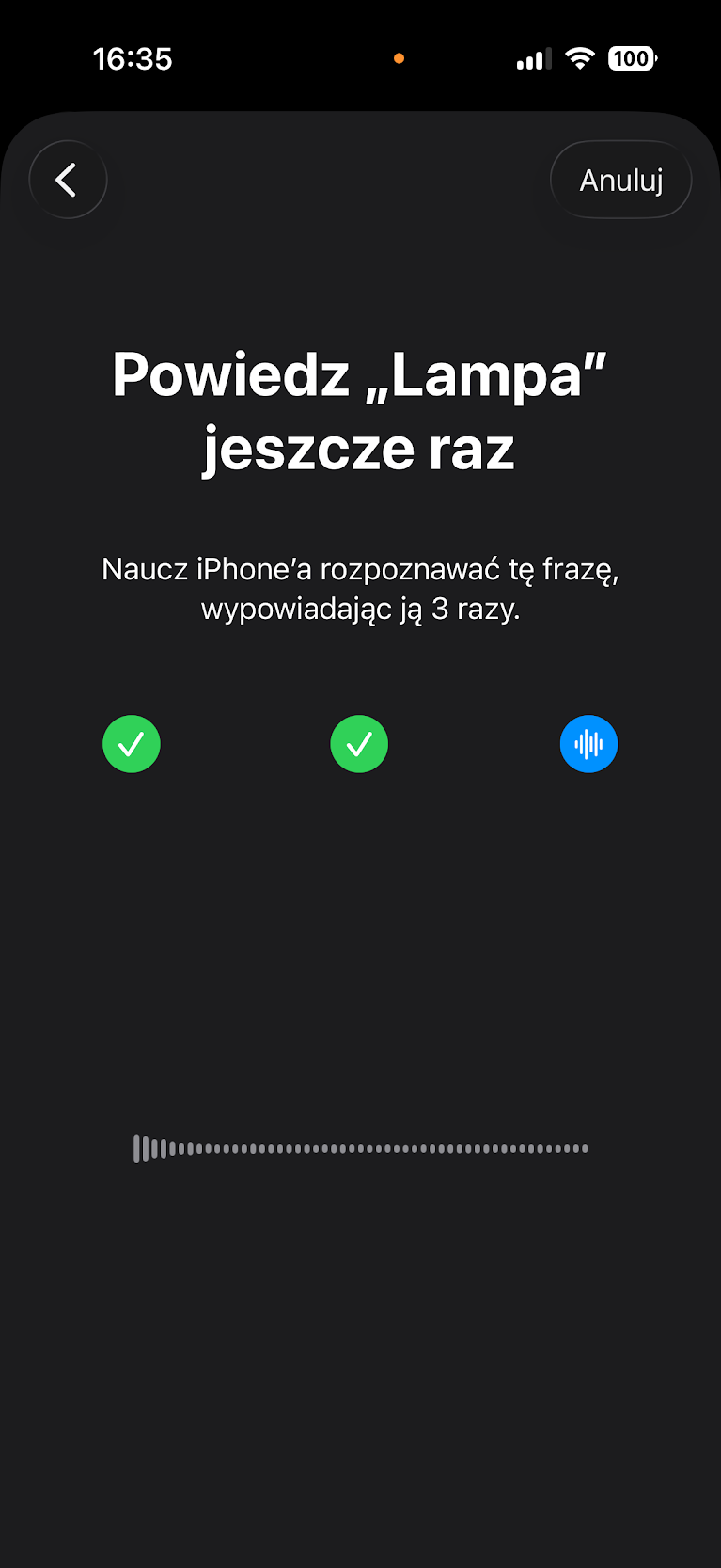 Oznacza to, iż aby krzyknąć „Lampa!”, ekran musi być wybudzony (podświetlony). jeżeli iPhone leży na stole z wygaszonym ekranem, będziesz musiał go najpierw wybudzić (np. funkcją „Podnieś, aby obudzić” jeżeli masz ją włączoną, albo jednak dotknąć ekranu), żeby komenda zadziałała.