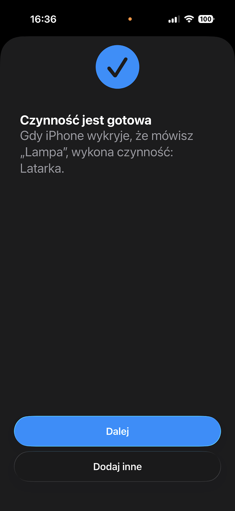 To wszystko. Od teraz, gdy telefon usłyszy ten dźwięk (wypowiadane przez Ciebie słowo „lampa”, włączy latarkę. Możesz analogicznie ustawić drugą komendę (np. „Ciemność”) do jej wyłączania.