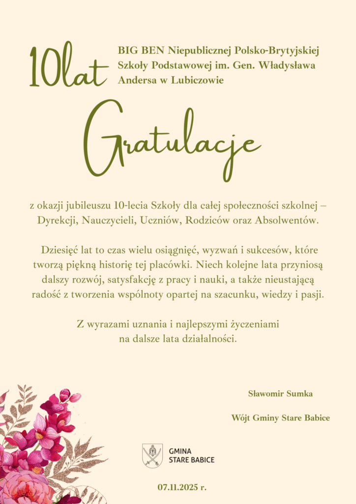 W dniu dzisiejszym w Domu Kultury Stare Babice odbyła się uroczystość z okazji jubileuszu 10-lecia Szkoły BIG BEN – Niepublicznej Polsko-Brytyjskiej Szkoły Podstawowej im. gen. Władysława Andersa w Lubiczowie. Wydarzenie to zgromadziło całą społeczność szkolną – Dyrekcję, Nauczycieli, Uczniów, Rodziców oraz Absolwentów.