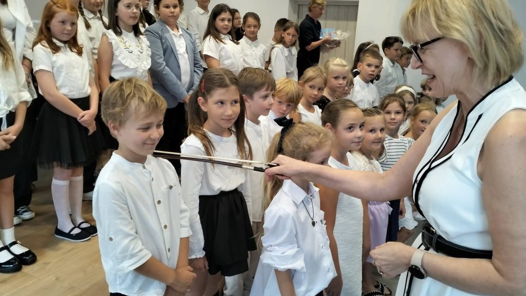 Podczas inauguracji nowi uczniowie zostali oficjalnie przyjęci do społeczności szkoły. Symboliczne pasowanie smyczkiem stało się już tradycją placówki i podkreśla wyjątkowy charakter tego miejsca, w którym edukacja łączy się z pasją.