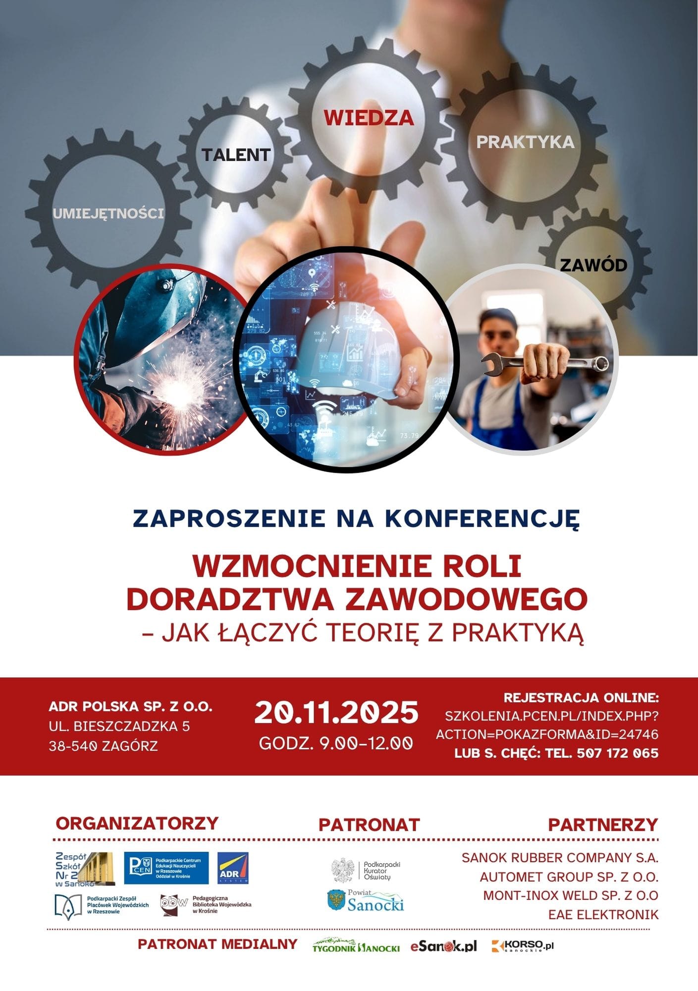 W czwartek, 20 listopada, w siedzibie ADR Polska w Zagórzu odbyła się konferencja poświęcona wzmocnieniu roli doradztwa zawodowego i skutecznemu łączeniu teorii z praktyką. W wydarzeniu uczestniczyli przedstawiciele instytucji oświatowych, samorządowych oraz firm prowadzących współpracę ze szkołami w zakresie kształcenia zawodowego.