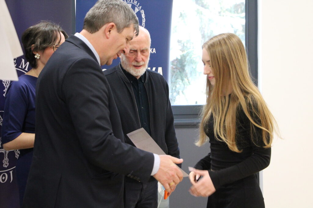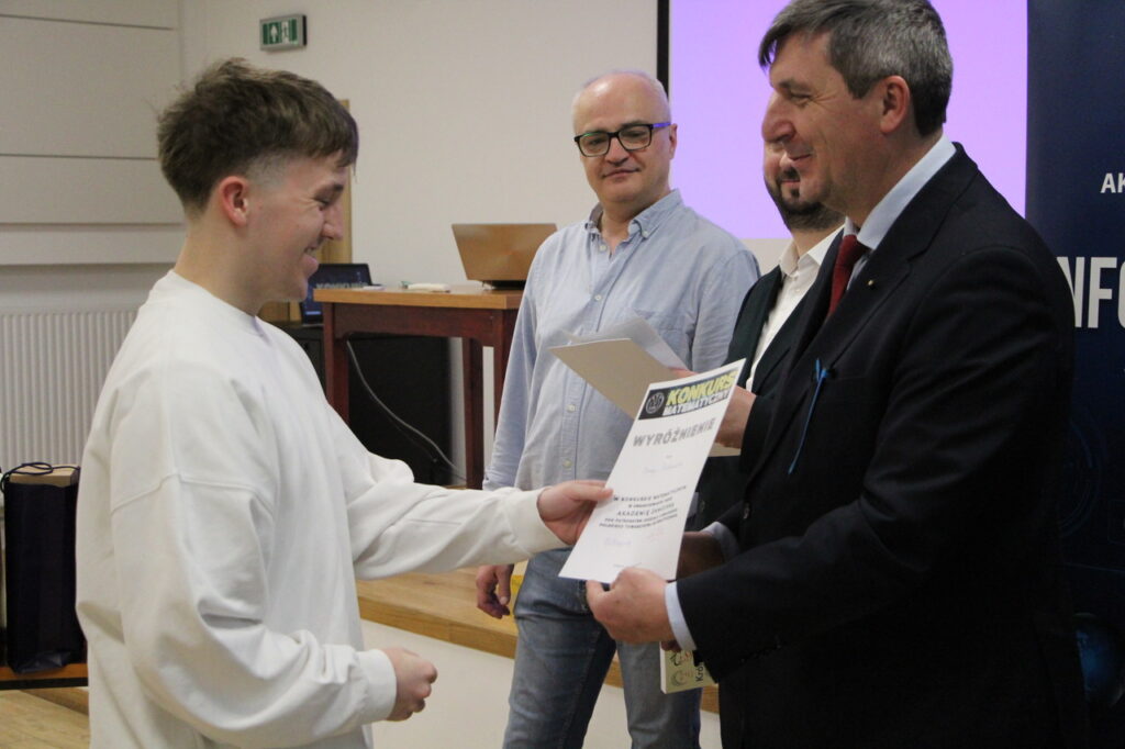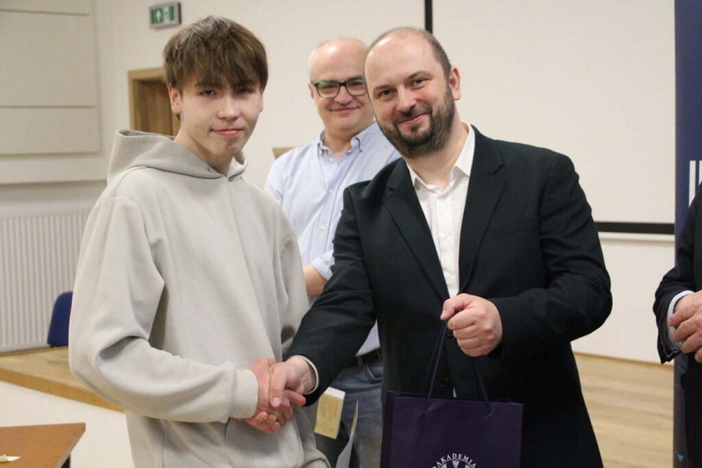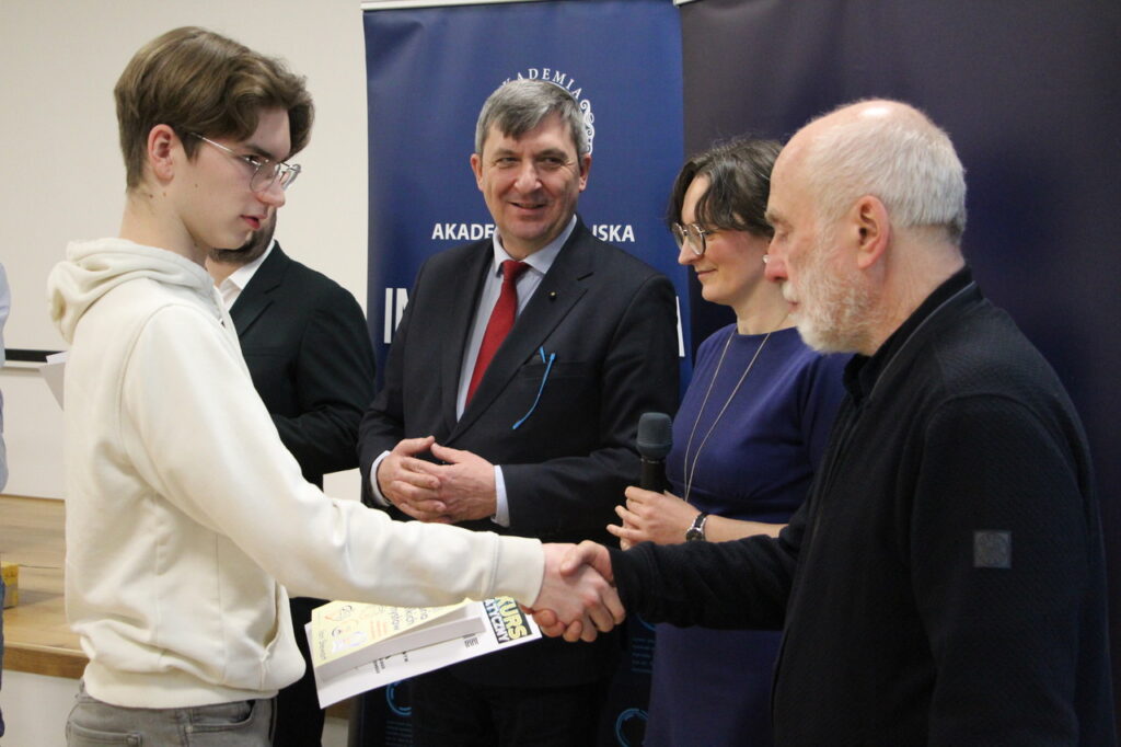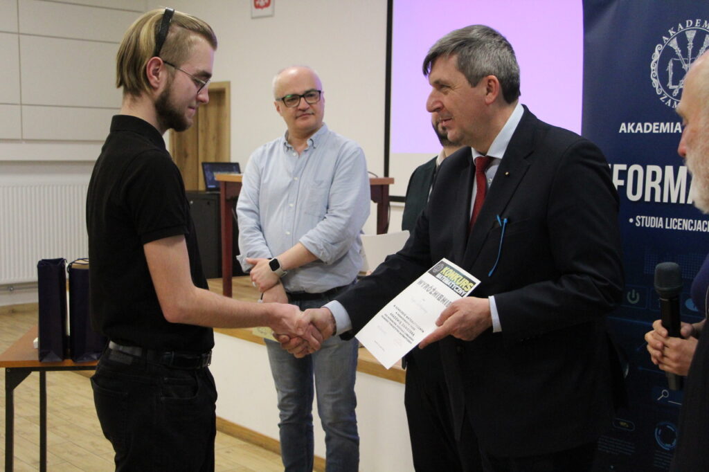 Trzej laureaci konkursu, którzy zdobyli największą liczbę punktów uhonorowanych zostanie nagrodami i dyplomami, natomiast finaliści wyróżnieni – dyplomy oraz upominki od Oddziału Lubelskiego Polskiego Towarzystwa Matematycznego. Nagrody laureatom i wyróżnionym uczestnikom Konkursu wręczali: rektor Akademii Zamojskiej dr hab. Paweł Skrzydlewski, prof. AZ, dziekan Wydziału Techniczno – Informatycznego AZ i dyrektor Instytutu Informatyki AZ dr inż. Paweł Prokop, prezes Lubelskiego Oddziału Polskiego Towarzystwa Matematycznego dr hab. Mariusz Bieniek, prof.ucz. oraz dr hab. Witold Mozgawa i dr Ewa Szlachtowska z Instytutu Informatyki AZ.
