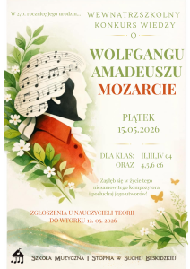 Nauczyciele teorii serdecznie zapraszają do udziału w wewnątrzszkolnym konkursie wiedzy o W. A. Mozarcie.
