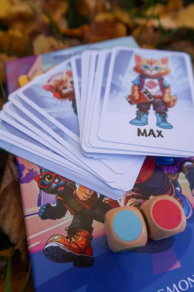 W środku znajdziecie 21 kart kotów, 5 kart z łapką kota i 2 kostki z kolorami.