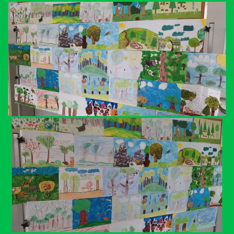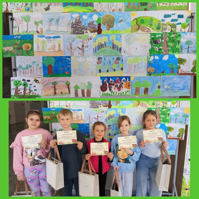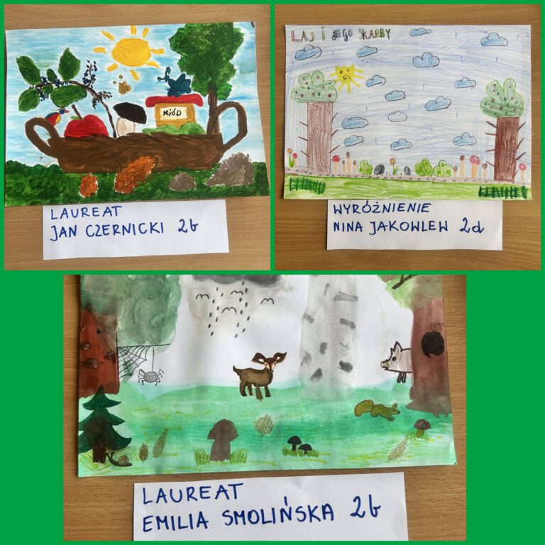 W lutym uczniowie klas II brali udział w szkolnym konkursie plastycznym „Las i jego skarby”. Dzieci wykonały przepiękne prace przedstawiające różne rodzaje lasów oraz liczne leśne skarby – grzyby, zwierzęta, drzewa i rośliny. Każda praca była starannie wykonana i pełna ciekawych pomysłów.