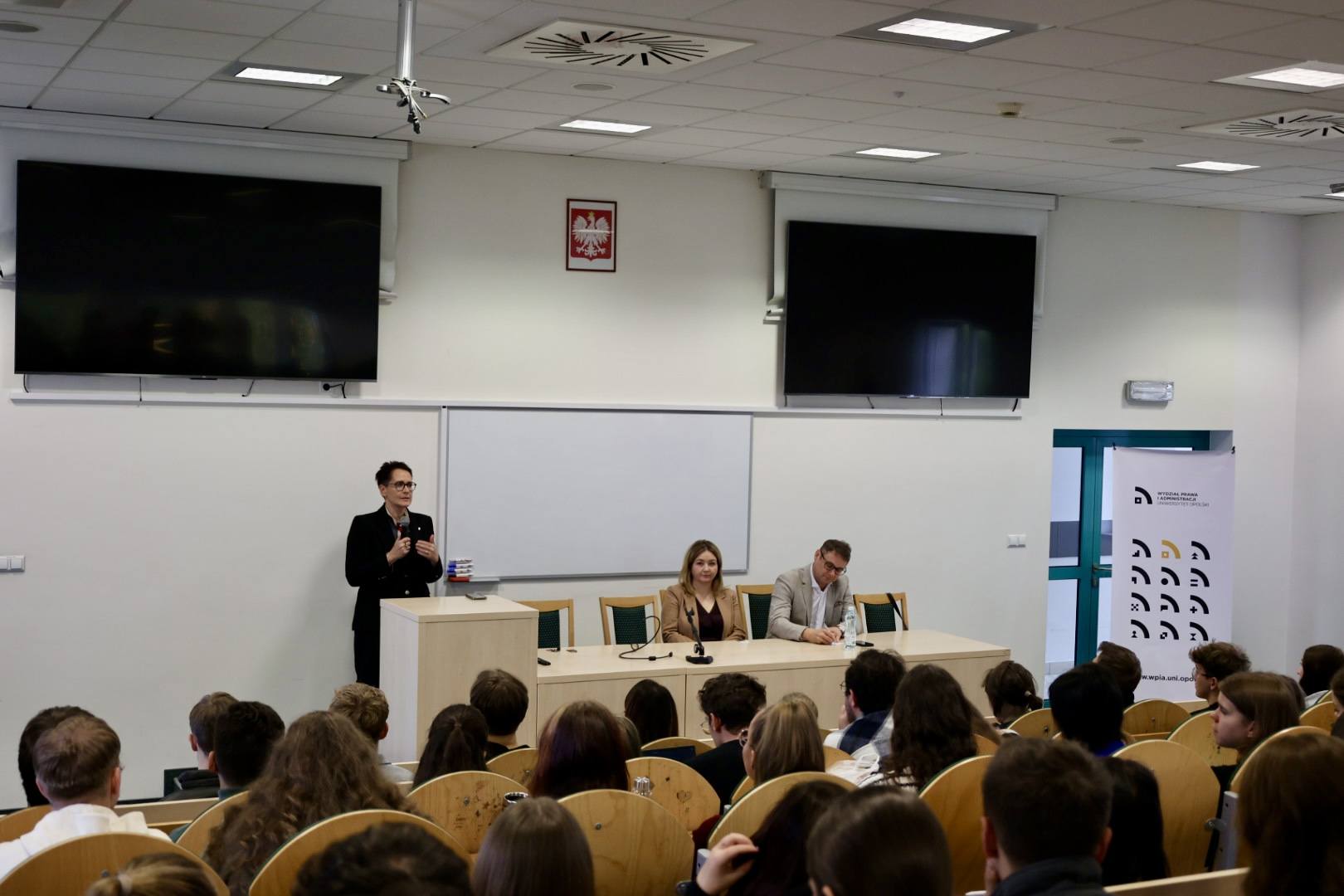Minister odwiedziła również Uniwersytet Opolski, gdzie rozmawiała z władzami uczelni i studentami Wydziału Prawa i Administracji oraz Wydziału Nauk o Polityce i Komunikacji Społecznej o współpracy nauki z administracją.
