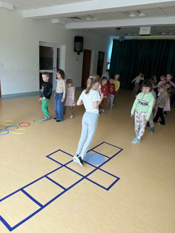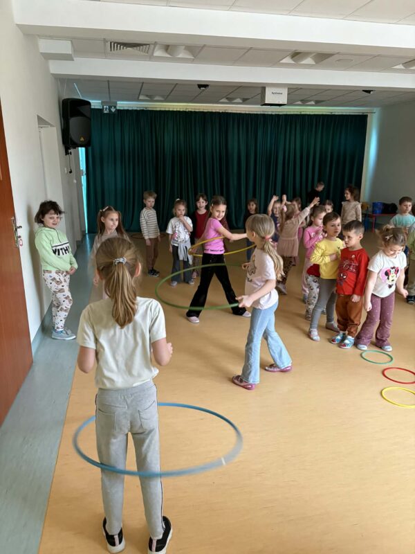 W związku z tym, dzieci miały okazję poznać i wypróbować zabawy podwórkowe, w które bawili się ich rodzice. Przedszkolaki z euforią uczestniczyły w takich aktywnościach jak: gra w klasy, zbijak oraz zabawy z hula-hop. Zajęcia przebiegały w radosnej i bezpiecznej atmosferze. Przedszkolaki chętnie angażowały się w rozmowy oraz wspólne zabawy, ucząc się jednocześnie, iż smutek jest naturalną emocją, a ruch, zabawa i wsparcie innych mogą pomóc w poprawie nastroju.