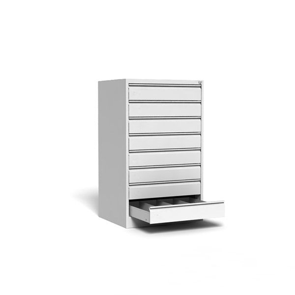 Popularne są także metalowe szafy na kartoteki. Meble te posiadają szuflady znajdujące się na teleskopowych prowadnicach kulkowych, umożliwiających pełen wysuw. W ten sposób zapewniony jest swobodny dostęp do wszystkich dokumentów – choćby tych, znajdujących się w tylnej części szuflady. Co istotne, szafy wzbogacone są w specjalny mechanizm, niepozwalający na wysunięcie się kilku szuflad jednocześnie – zapobiega to przewróceniu się mebla.