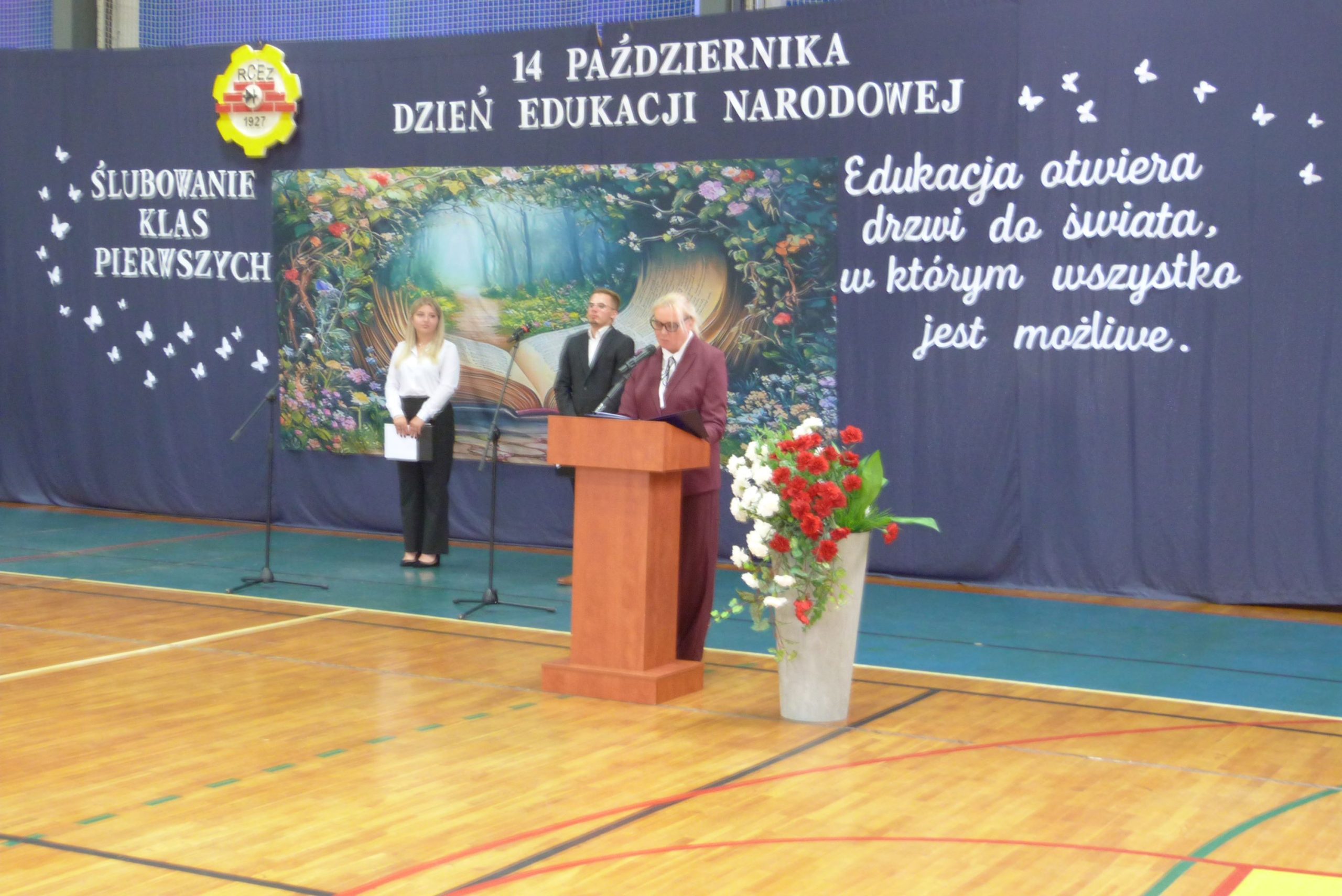 Najważniejszym punktem uroczystości było ślubowanie uczniów klas pierwszych. W tym roku do społeczności szkolnej RCEZ przyjęci zostali uczniowie dziesięciu klas pierwszych. Młodzi adepci stanęli przed sztandarem szkoły, z ręką uniesioną w geście przysięgi, składając obietnicę pilnej nauki, szacunku dla nauczycieli oraz dbałości o rozwój własnych umiejętności. Z rąk Pani Dyrektor i gości otrzymali pamiątkowe dyplomy oraz usłyszeli słowa wsparcia, które będą towarzyszyć im przez cały okres edukacji. Uroczystość ta była okazją do wyrażenia szacunku wobec tradycji szkolnej, jak również symbolicznym momentem, w którym młodsze pokolenie braci uczniowskiej rozpoczęło swoją drogę, pełną nowych wyzwań i nadziei uwiecznioną w dekoracji tej uroczystości z symbolicznym, literackim przesłaniem …otaczaj się ludźmi, którzy wywołują uśmiech na twojej twarzy….