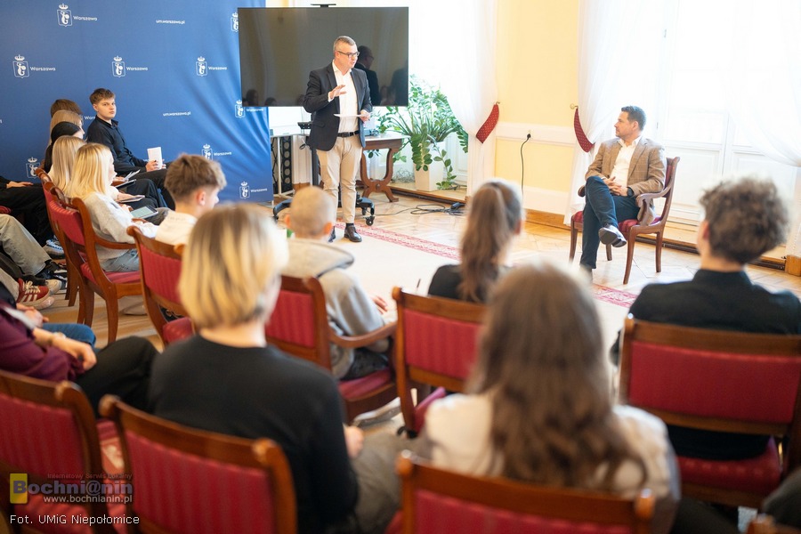 Uczniowie z Zespołu Szkół im. Ojca Świętego Jana Pawła II w Niepołomicach wzięli udział w spotkaniu w formule Q&A z prezydentem Warszawy Rafałem Trzaskowskim. Wydarzenie miało charakter edukacyjny i było związane z realizowanym w szkole rozszerzonym programem nauczania obejmującym wiedzę o społeczeństwie, geografię oraz gospodarkę przestrzenną.