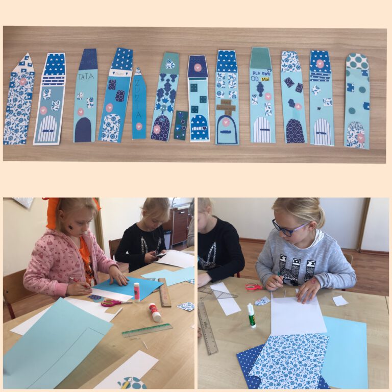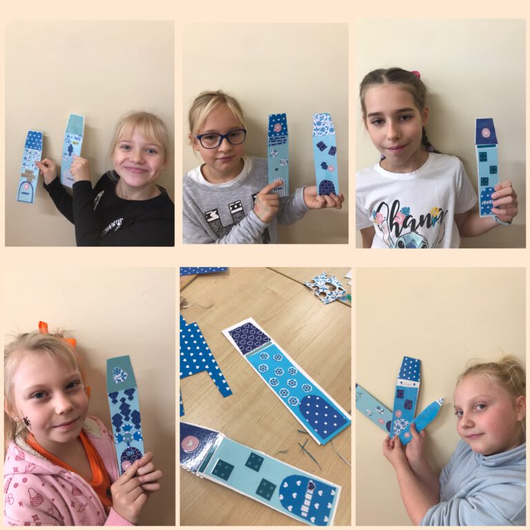 Na kolejnych zajęciach Mali artyści z SP21 – w ramach Programu Edukacji Kulturalnej Dzieci i Młodzieży Zielonogórskiego Ośrodka Kultury, zaprojektowali zakładki do książek wykorzystując niebieski kolor oraz jego odcienie, a także różne faktury papieru.