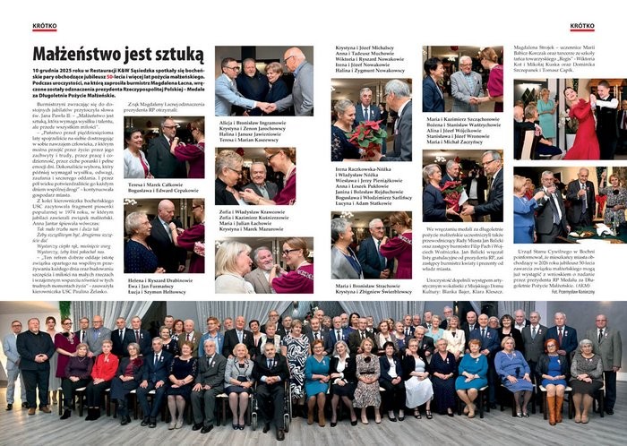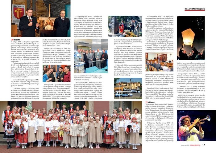 – „Wielokrotnie podkreślaliśmy, iż publikowanie od 1997 roku naszych specyficznych kalendarzy ma na celu nie tylko prostą rejestrację faktów z przeszłości, ale także nadawanie im nowych znaczeń w teraźniejszości” – tłumaczy redakcja we wstępie do Kalendarium 2026, które powstało w oparciu o zestawienia pozostawione przez zmarłego w 2023 roku Jana Flaszę i materiały własne. Samo kalendarium wydaje się wystarczającym powodem, by sięgnąć po noworoczny numer „Kroniki Bocheńskiej”. Ukontentowani będą jednak nie tylko miłośnicy historii, ale także – jak zawsze – fani podróży, sportu i młodzież. W styczniowo-lutowym numerze (108 stron), którego okładkę zdobi zdjęcie „morsów” podczas charytatywnej akcji na rzecz WOŚP, można odnaleźć bogate w zdjęcia relacje ze studniówek oraz fotografie zbiorowe maturzystów I i II Liceum Ogólnokształcącego.