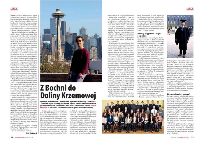 Pytany o dzieciństwo, wymienia mikroskop i teleskop. – „Dostałem je pod choinkę, gdy miałem pięć lat. Zawsze interesowało mnie, jak wszystko działa. Fascynowała mnie fizyka i astronomia” – mówi Konrad Chlupka. Ta ciekawość świata zaprowadziła go niedługo do Doliny Krzemowej. Dziś pracuje jako Site Reliability Engineer w Google i mieszka w Silicon Valley, kilka minut jazdy od Stanfordu.