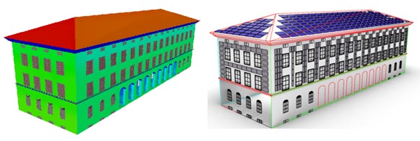 Grafika: Potencjał paneli fotowoltaicznych oszacowany przy pomocy naszych cyfrowych bliźniaków (po lewej) i już z wirtualnie zasymulowanymi panelami (po prawej).