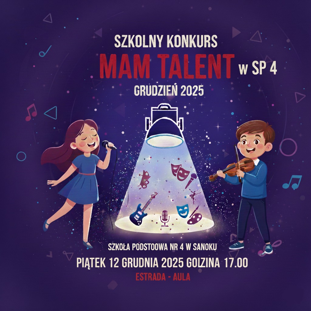 Szkoła Podstawowa nr 4 w Sanoku zaprasza mieszkańców miasta na wyjątkowe wydarzenie artystyczne. Już w piątek, 12 grudnia o godzinie 17.00, szkolna estrada zamieni się w pełną świateł i emocji scenę podczas pierwszego szkolnego koncertu „Mam Talent”.