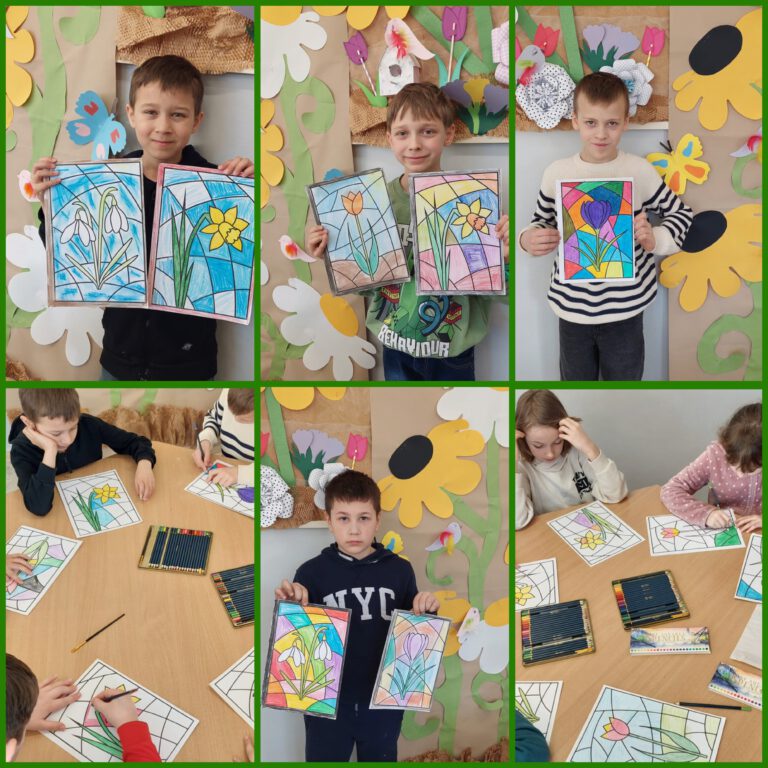 Wiosenne kwiaty w witrażach, kwiaty wykonane kredkami akwarelowymi i pastelowymi.