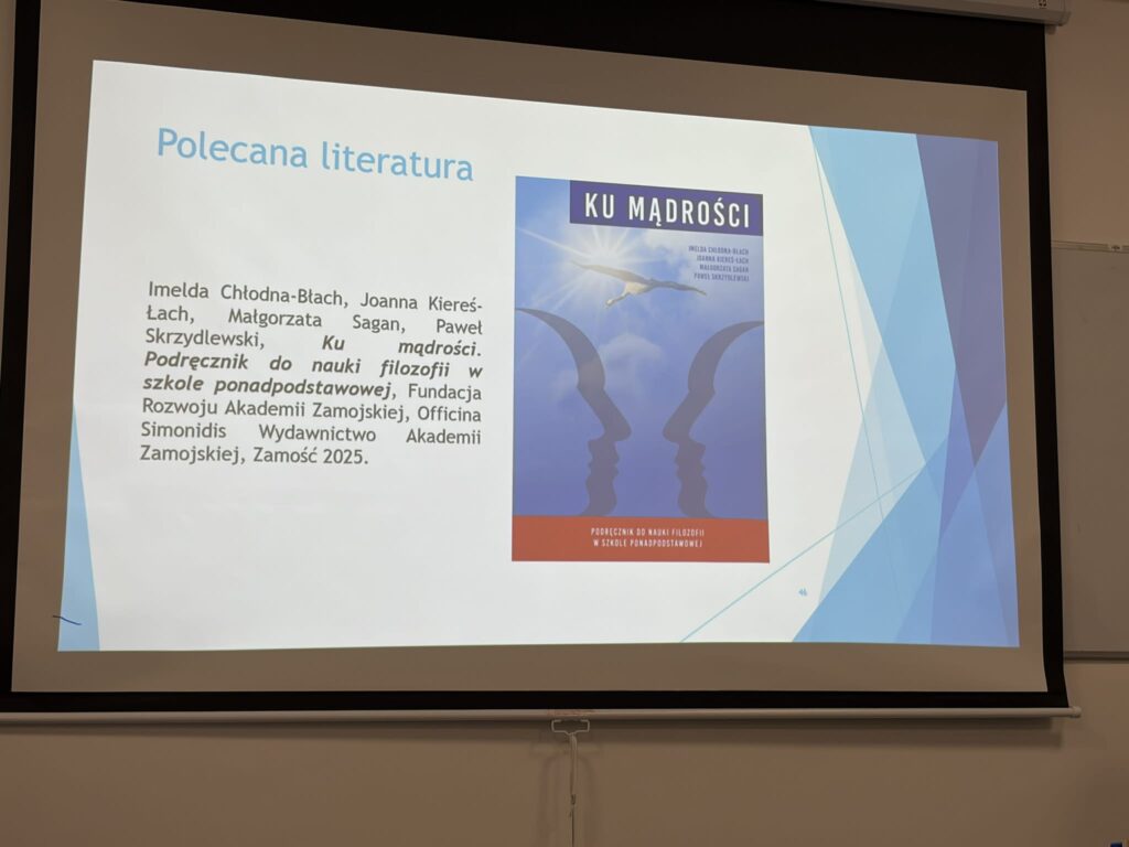 Podczas spotkania zachęcono uczestników do zapoznania się z wydanym przez Officina Simonidis – Wydawnictwo Akademii Zamojskiej podręcznikiem do filozofii dla szkół ponadpodstawowych „Ku mądrości” autorstwa Imeldy Chłodnej-Błach, Joanny Kiereś-Łach, Małgorzaty Sagan oraz Pawła Skrzydlewskiego.