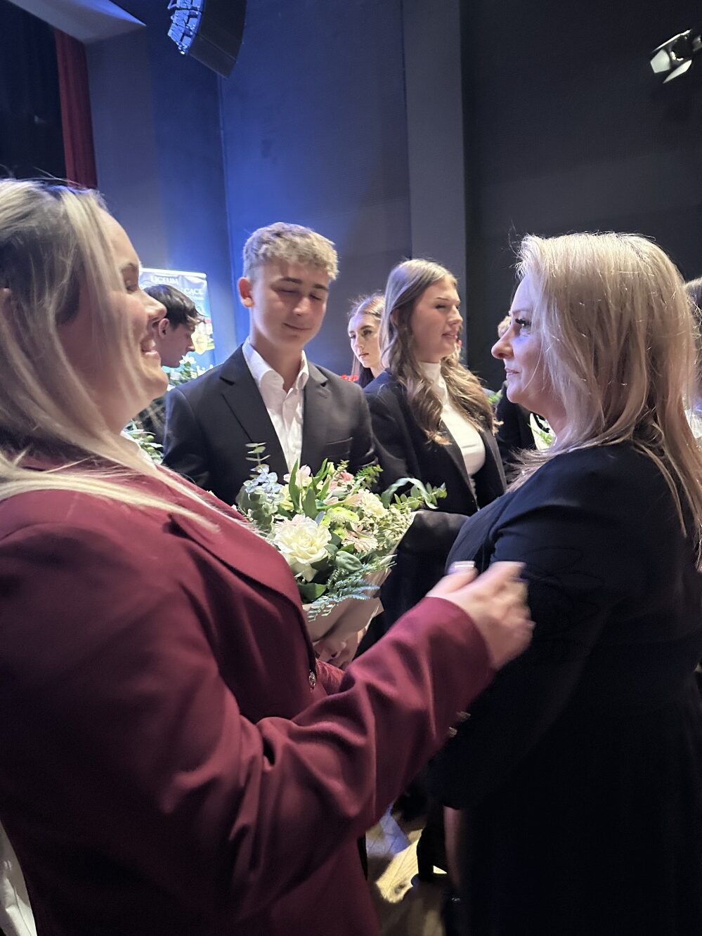Życzenia w imieniu Starostwa Powiatowego przekazała pani skarbnik Barbara Fuszara, podkreślając znaczenie egzaminu maturalnego oraz odpowiedzialnych wyborów życiowych. Życzenia oraz podziękowania złożyła także przewodnicząca Rady Rodziców Magdalena Kolasa, podkreślając bardzo dobrą współpracę z dyrekcją szkoły oraz rodzicami uczniów. Pełne wzruszenia były także słowa księdza Tomasza Kopcia, który także podziękował wszystkim za współpracę oraz życzył młodzieży wielu sukcesów. Szczególne słowa wdzięczności skierowano również do pani Magdaleny Kolasy, która po czterech latach pełnienia funkcji przewodniczącej Rady Rodziców, kończy swoją kadencję, dziękując jej za zaangażowanie, wsparcie oraz wkład w rozwój szkoły i społeczności uczniowskiej.