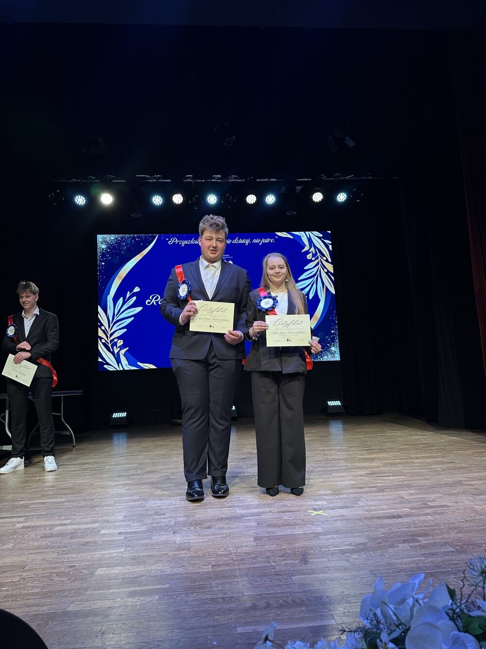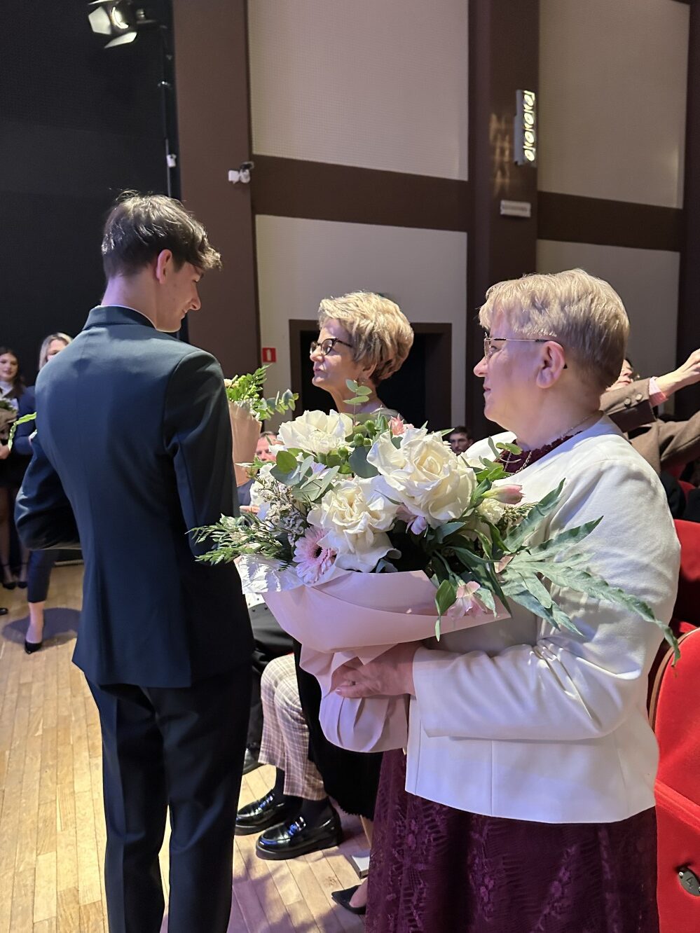 Wśród zaproszonych gości byli: Starosta Janowski Artur Pizoń oraz przewodnicząca Rady Rodziców Magdalena Kolasa. Proboszcza Parafii Świętego Jana Chrzciciela, księdza kanonika Tomasza Lisa, reprezentował ksiądz Tomasz Kopeć, natomiast Starostwo Powiatowe reprezentowała pani skarbnik Barbara Fuszara. Szczególnymi gośćmi szkoły byli dzisiaj także rodzice naszych wyróżnionych abiturientów, którzy odebrali z rąk dyrektor Wiesławy Dyjach listy gratulacyjne. Reprezentanci maturzystów złożyli podziękowania za cztery lata edukacji w I LO. Ciepłe słowa skierowali w stronę dyrektor szkoły Wiesławy Dyjach oraz wicedyrektor Ireny Dychy. Nie zabrakło także serdeczności kierowanych do wychowawców, katechetów oraz całego grona pedagogicznego.