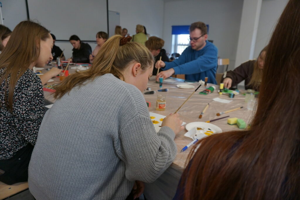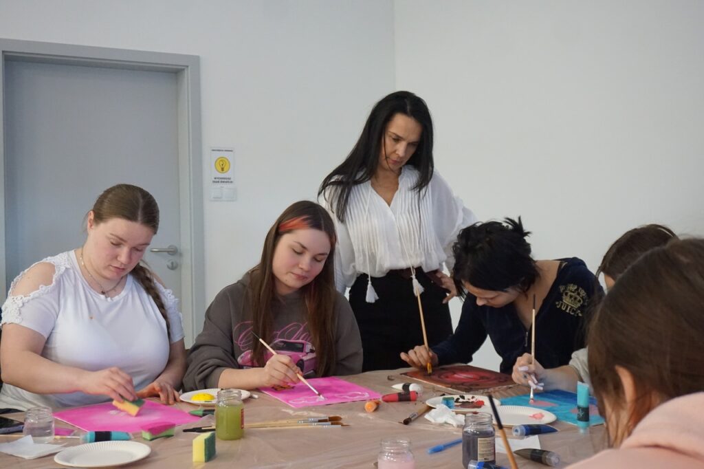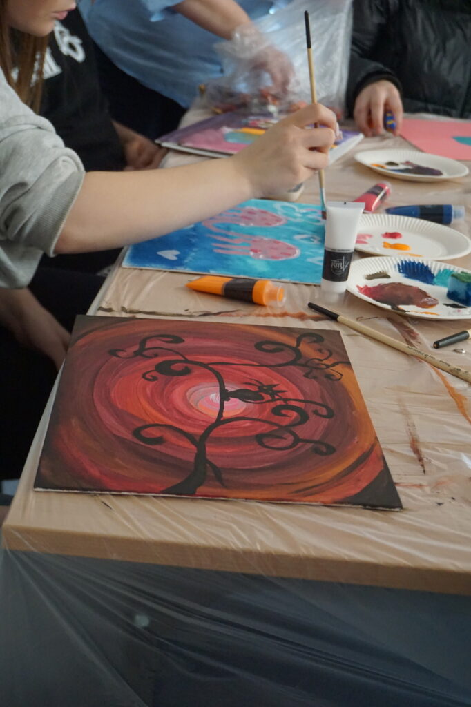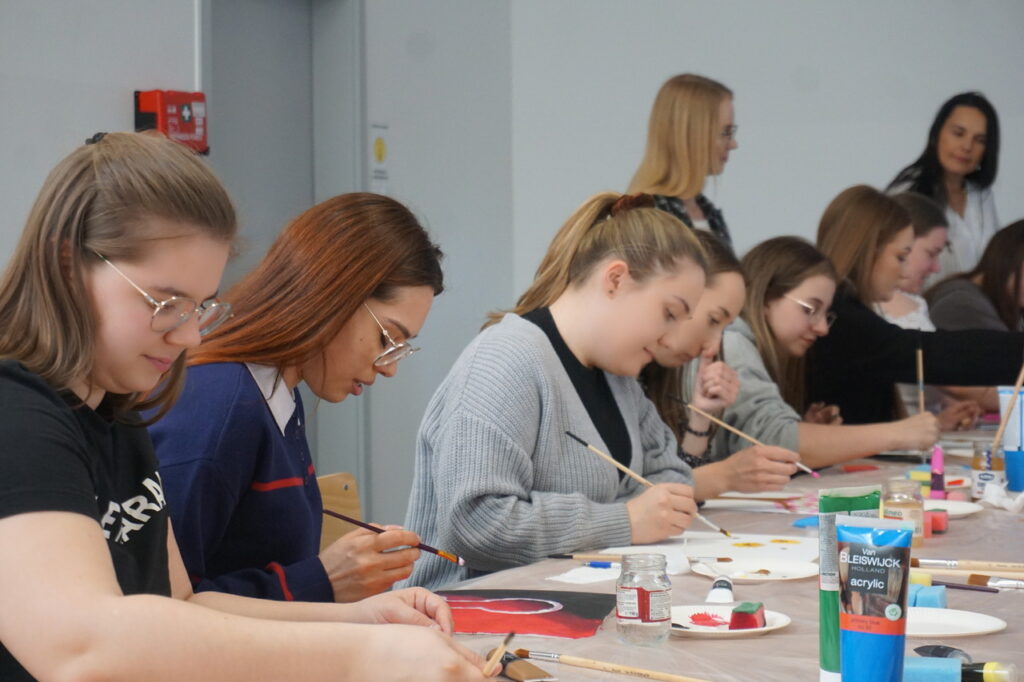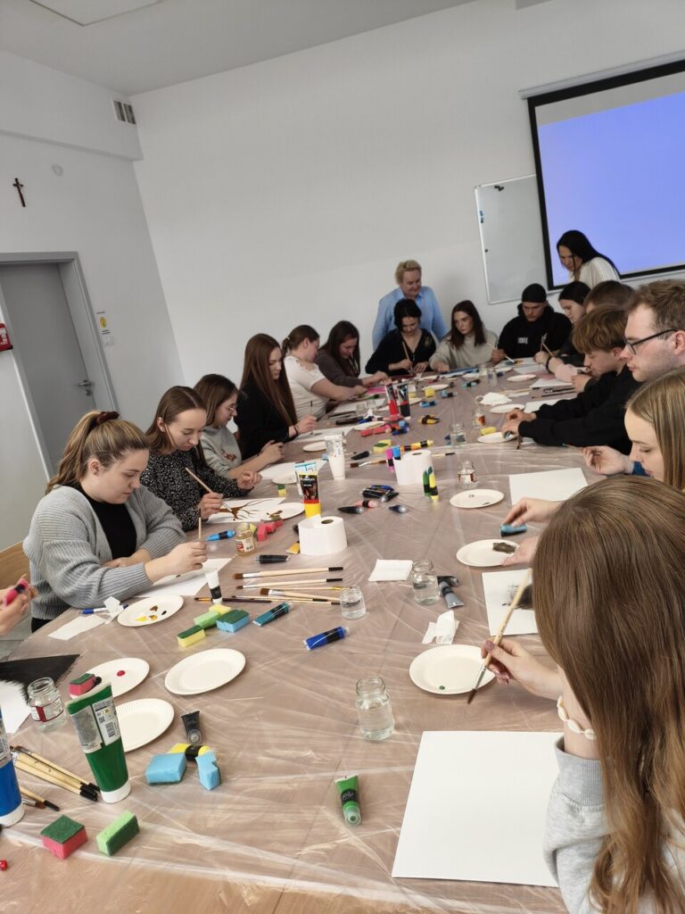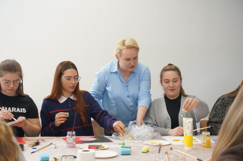 Tematem spotkania zaproponowanym i opracowanym przez studentów był: Kolory emocji – jak emocje wyglądają na obrazie. Celem głównym spotkania było rozwijanie umiejętności rozpoznawania i wyrażania emocji w sposób twórczy. Zajęcia rozpoczęły się od powitania uczestników, ćwiczenia integracyjnego, a następnie każdy po krótkim wprowadzeniu przeszedł do malowania własnej pracy na płótnie. Na zakończenie nie zabrakło omówienia swoich prac, zachwytów, a choćby zaskoczeń.