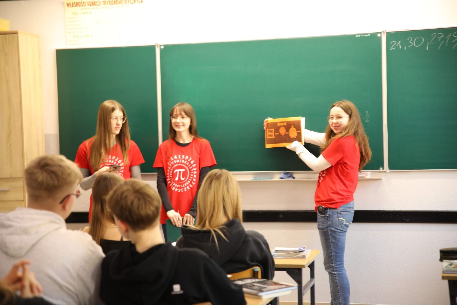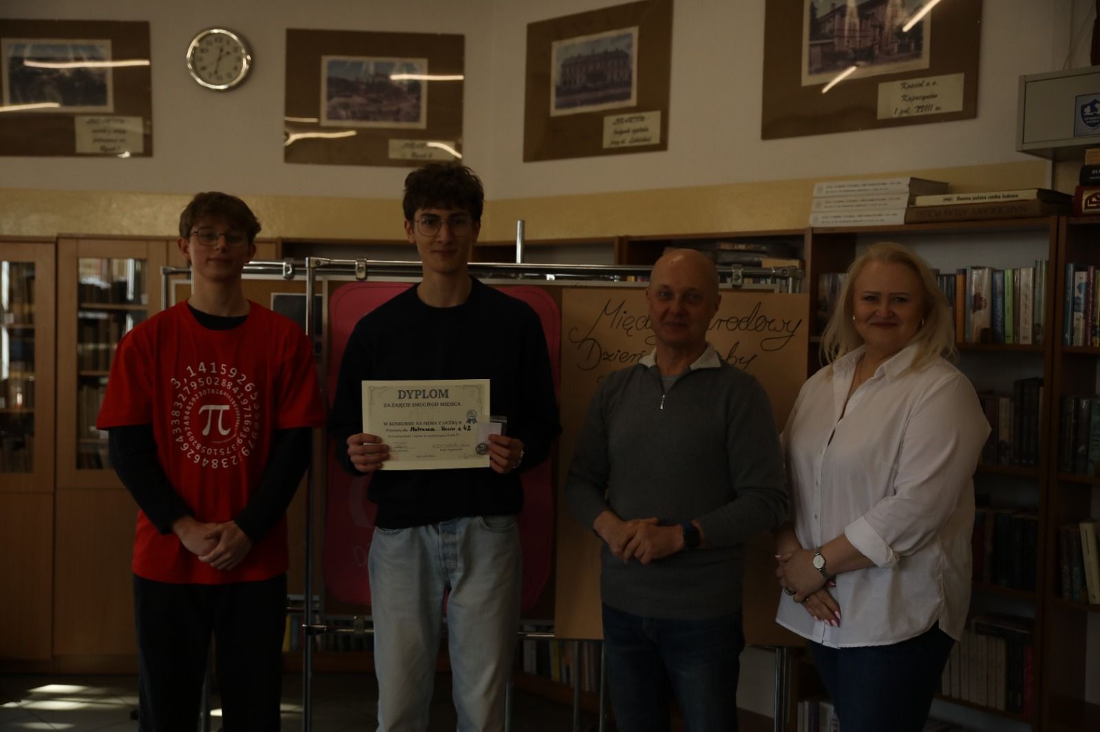 Odbył się też Konkurs Matematyczny z zadaniami dotyczącymi liczby π, czyli wszystko, co dotyczy koła i okręgu. Frekwencja nie była duża, ale uczestnicy uzyskali wysokie wyniki. Finalnie zwycięstwo rozstrzygnęło się jednym punktem. Zwycięzcą został Mateusz Kucio, a tuż za nim znaleźli się: Martyna Kobyłka, Iga Markiewicz oraz Dominik Siwek.