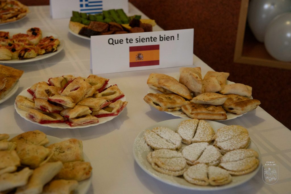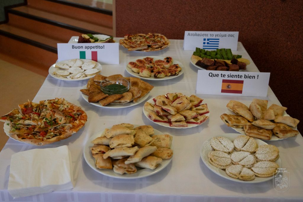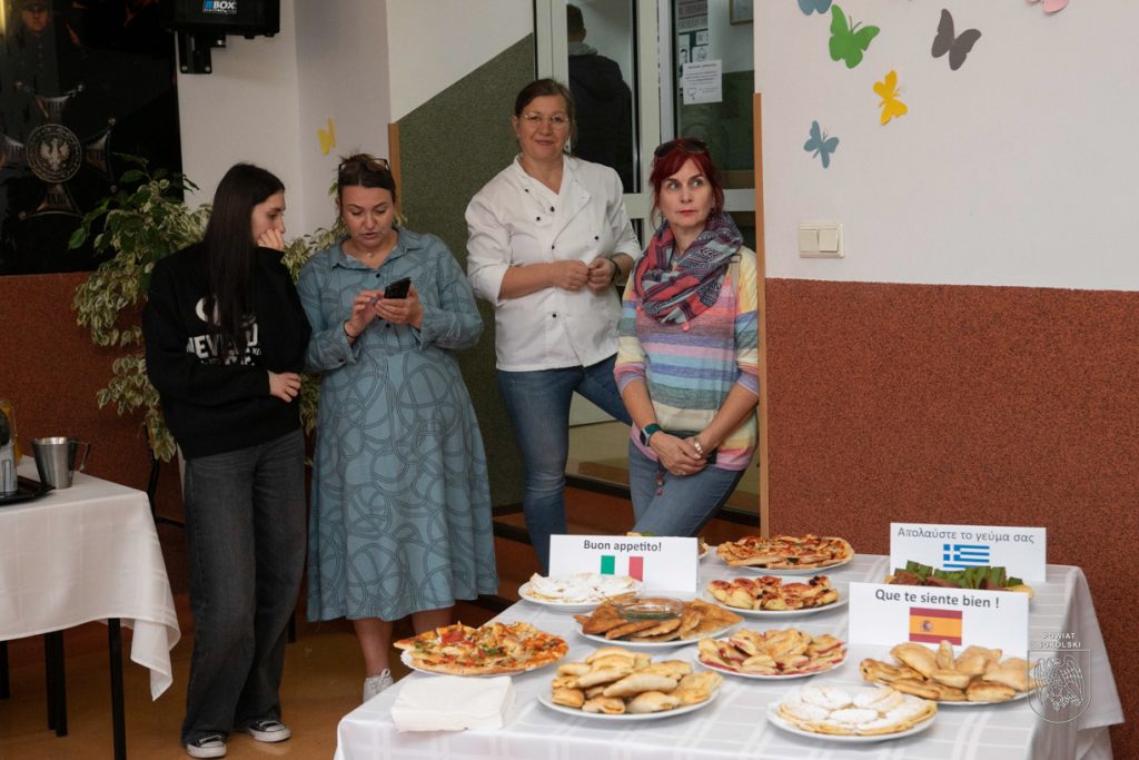 Na uczestników spotkania czekał słodko-słony, a przede wszystkim zdrowy poczęstunek. Przygotowane potrawy nawiązywały do kuchni krajów, do których uczniowie wyjeżdżają w ramach programu Erasmus+.