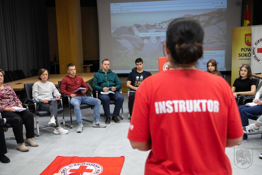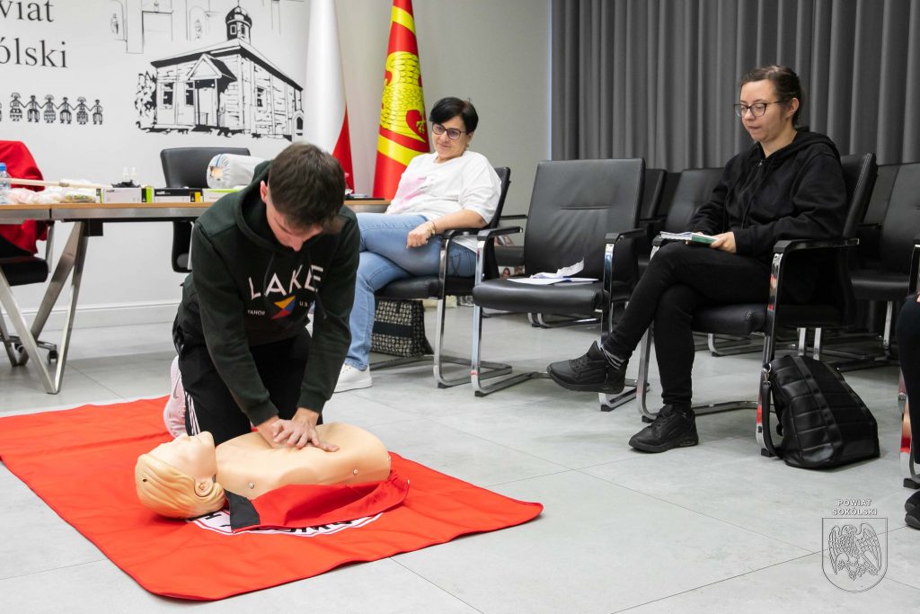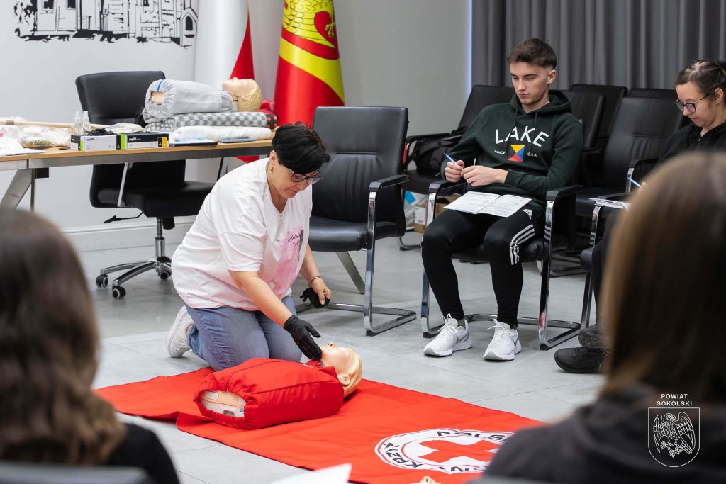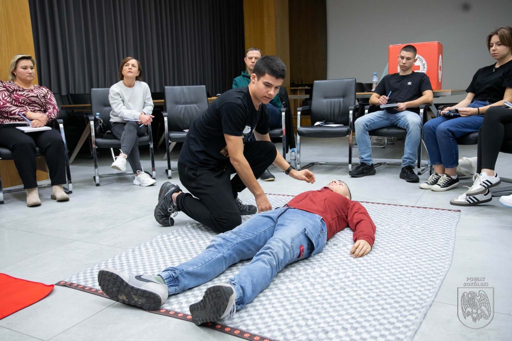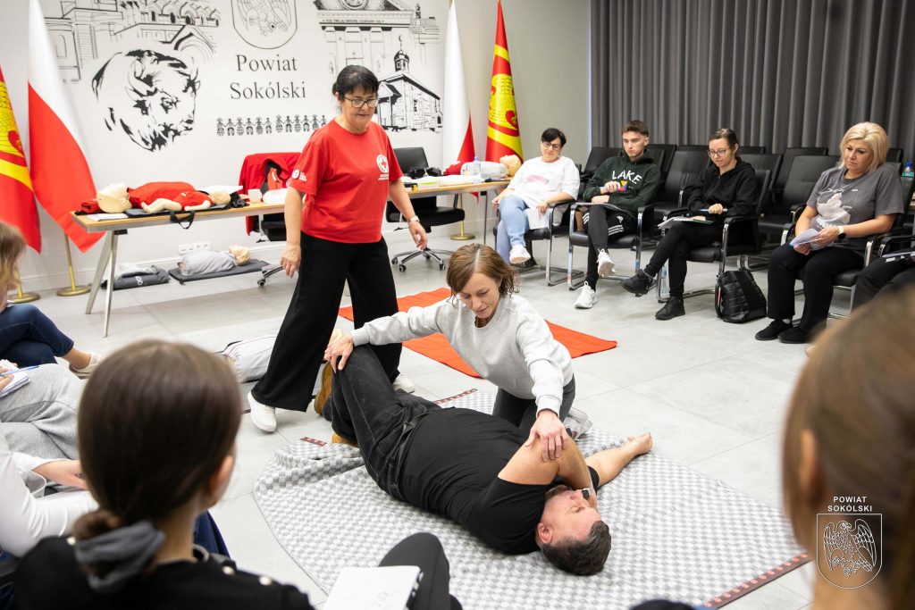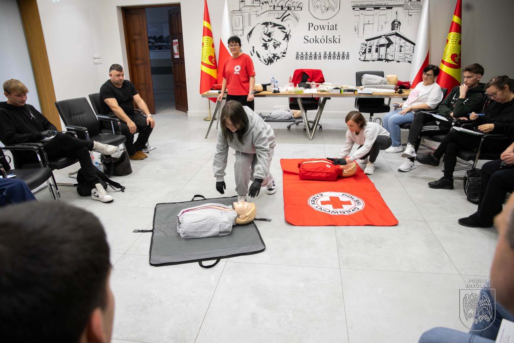 W sali konferencyjnej Starostwa Powiatowego w Sokółce odbywa się dziś pierwsze z dwóch podstawowych szkoleń organizowanych w ramach projektu Polskiego Czerwonego Krzyża „Uczmy się pierwszej pomocy”. Uczestnicy – nauczyciele oraz młodzież ze szkół ponadpodstawowych Powiatu Sokólskiego, zdobywają wiedzę i umiejętności z zakresu udzielania pierwszej pomocy.