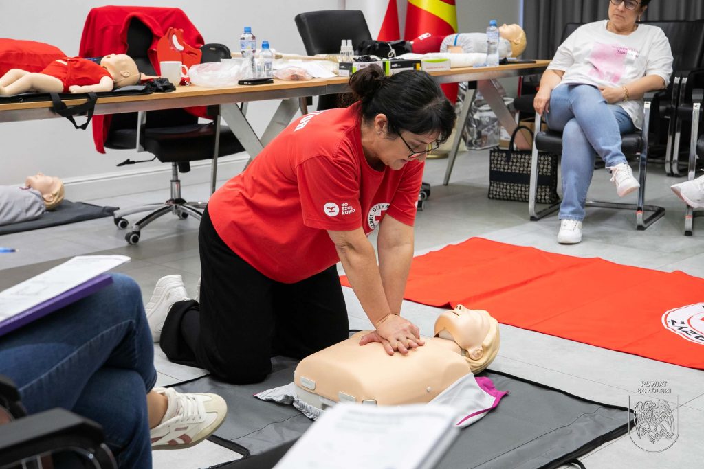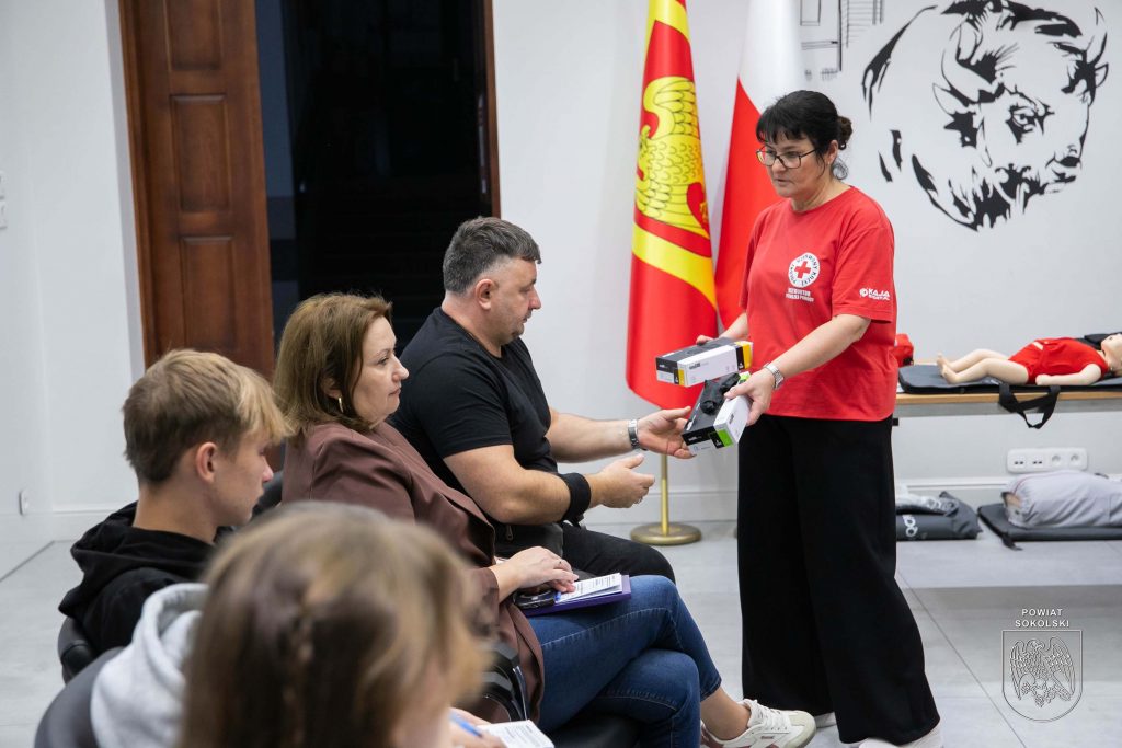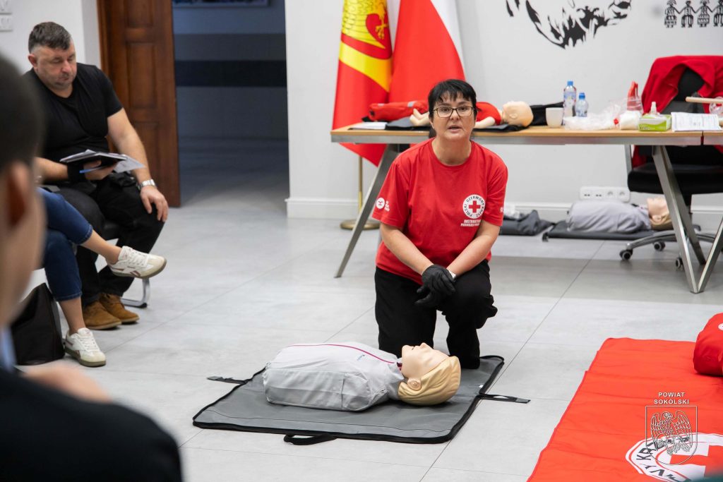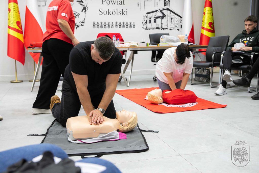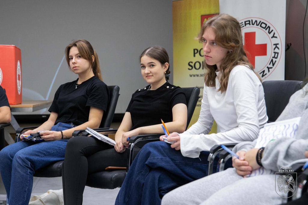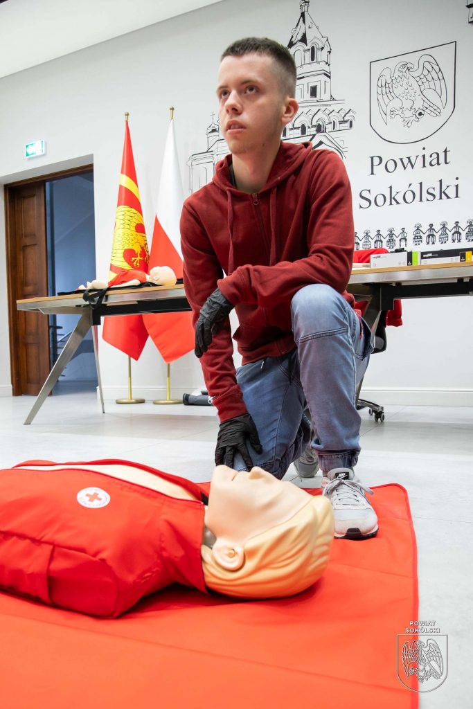 W sali konferencyjnej Starostwa Powiatowego w Sokółce odbywa się dziś pierwsze z dwóch podstawowych szkoleń organizowanych w ramach projektu Polskiego Czerwonego Krzyża „Uczmy się pierwszej pomocy”. Uczestnicy – nauczyciele oraz młodzież ze szkół ponadpodstawowych Powiatu Sokólskiego, zdobywają wiedzę i umiejętności z zakresu udzielania pierwszej pomocy.