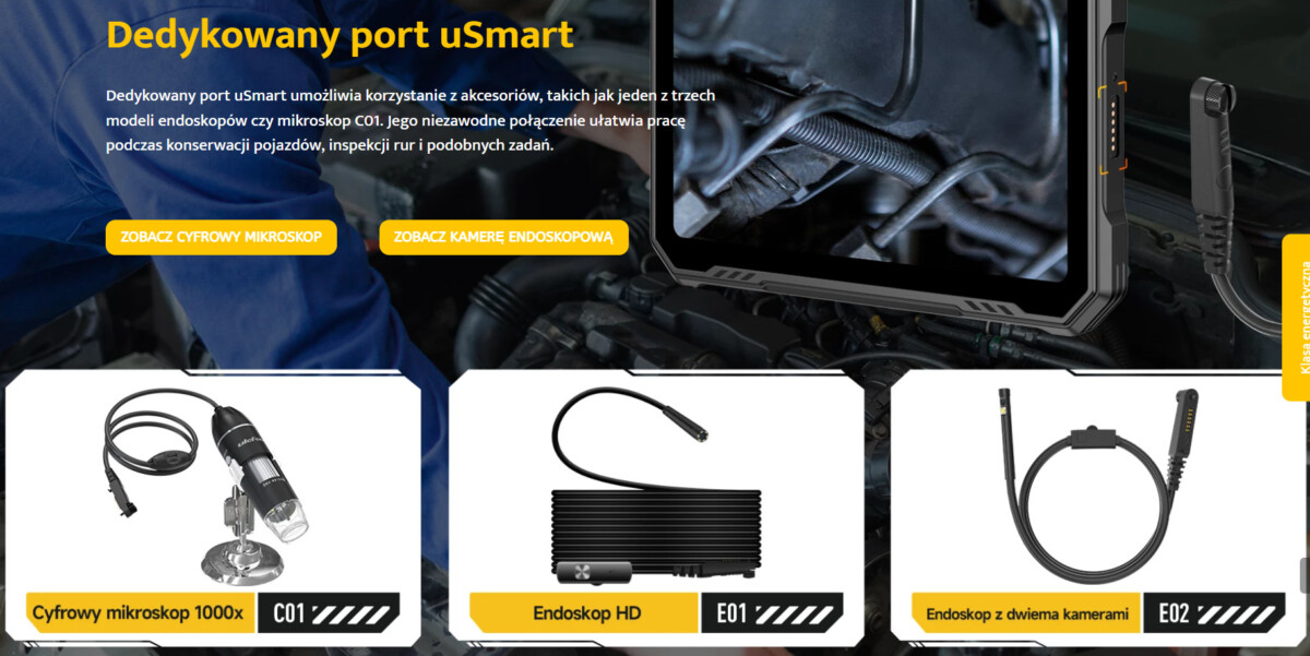 Jak podaje producent, tablet został wyposażony w różne funkcje mające ułatwiać pracę w terenie, np. poziomicę czy kompas. Ma też specjalny port, który pozwala na podłączenie endoskopu czy mikroskopu, co może pomóc np. przy naprawie auta. Te pierwsze nie wydają się zbyt przydatne – ponownie, ze względu na ciężar tabletu. Kto by nosił taki balast zamiast poziomicy czy kompasu, które ważą kilka gram? Port jednak może być całkiem ciekawą funkcją i tu widziałabym najlepsze zastosowanie tabletu – jako ekran, który ma ułatwić dalszą pracę zamiast w niej przeszkadzać.