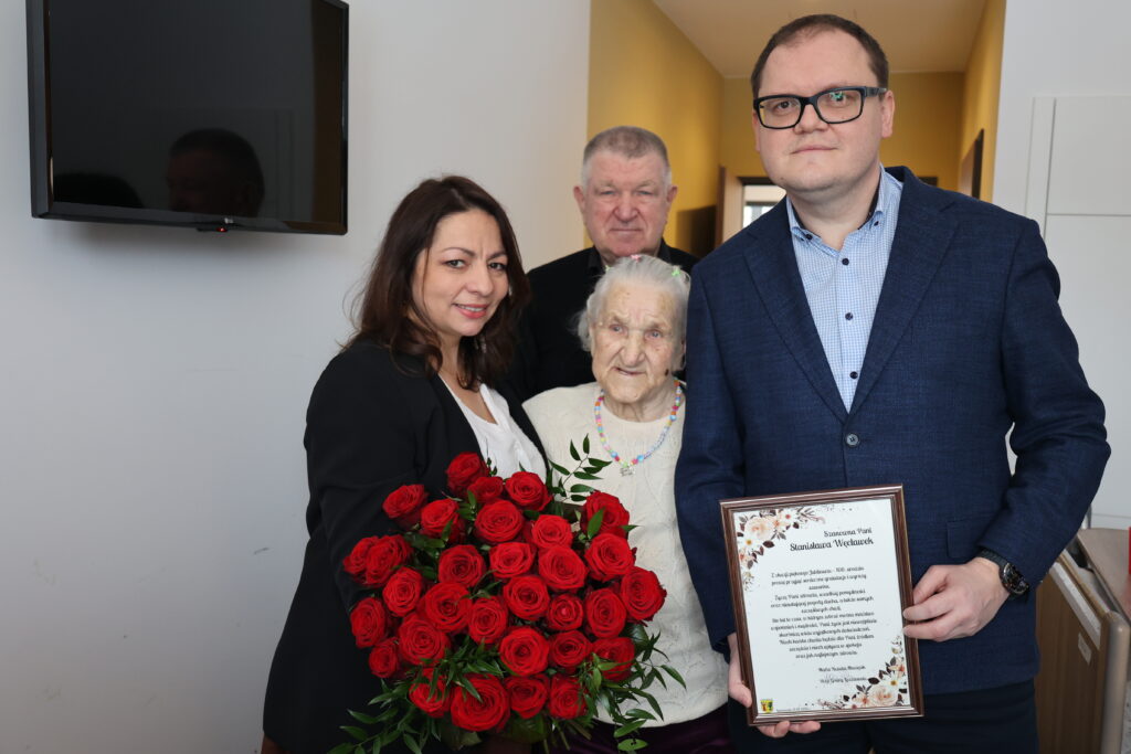 Tydzień później Zastępca Wójta Oktawian Druzd w towarzystwie kierownik Joanny Barańskiej odwiedzili drugą Jubilatkę. Pani Stanisława Węcławek urodziła się pod Lwowem, a po wojnie zamieszkała najpierw w Antoninowie, a następnie w Łazach. Całe życie ciężko pracowała, czemu – jak mówi – zawdzięcza dobre zdrowie. Mimo zaawansowanego wieku jest osobą pogodną, która bardzo lubi towarzystwo innych ludzi. Chętnie opowiada o swoim życiu, przejściach wojennych i pracy na gospodarstwie. Pani Stanisława w ubiegłym roku złamała kość udową. Dlatego trafiła do ośrodka rehabilitacyjnego, w którym dochodzi do siebie. Doczekała się 5 dzieci, 12 wnucząt, 12 prawnucząt i 8 praprawnucząt. Wicewójt Oktawian Druzd przekazał pani Stanisławie gratulacje oraz życzenia zdrowia, pomyślności i nieustającej pogody ducha, zarówno w imieniu swoim, jak i Wójt Marty Natalii Maciejak.