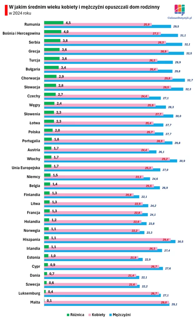 Średni wiek opuszczenia rodzinnego domu w 2024 roku przez kobiety i mężczyznOpracowanie ciekawestatystyki.pl na podstawie danych Eurostat