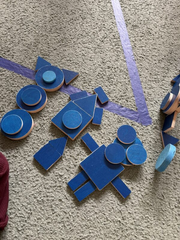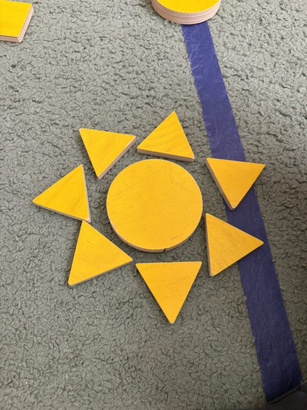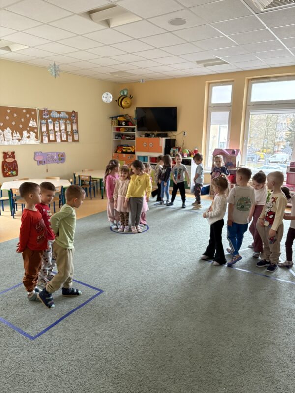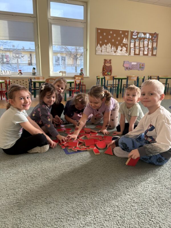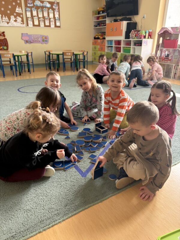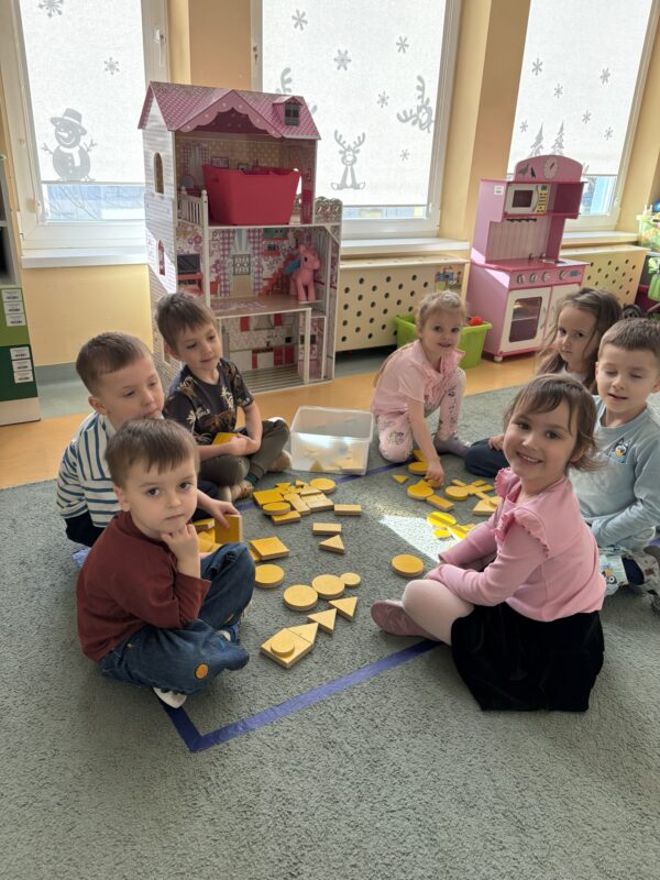 W ramach realizowanej tematyki Pszczółki przeniosły się do świata figur i kolorów. Dzieci utrwalały rozpoznawanie i nazywanie podstawowych figur geometrycznych: koło, kwadrat, trójkąt i prostokąt. Poprzez aktywne zabawy segregowały, przeliczały, tworzyły różne kompozycje z klocków, jak również rozwijały umiejętność pracy w grupie. Zajęcia z kolorami opierały się na utrwalaniu i rozpoznawaniu barw, jednocześnie wspierając przy tym motorykę małą.