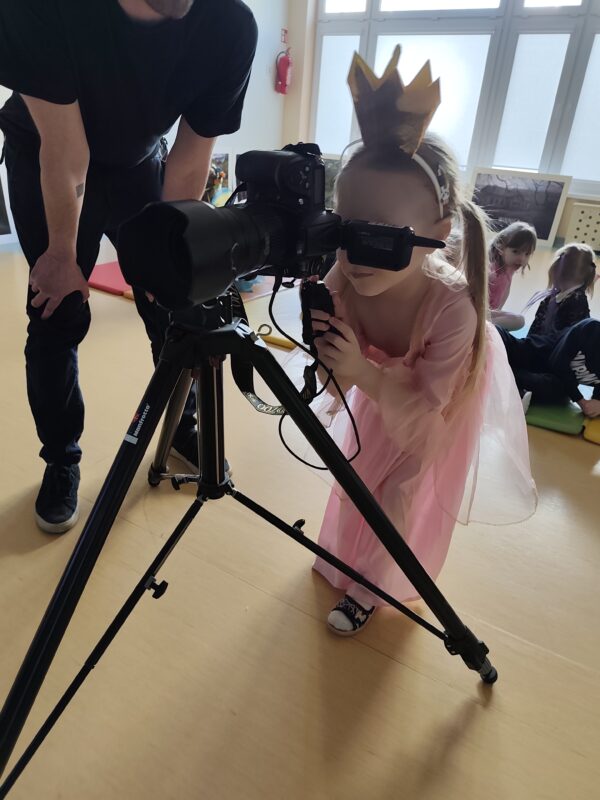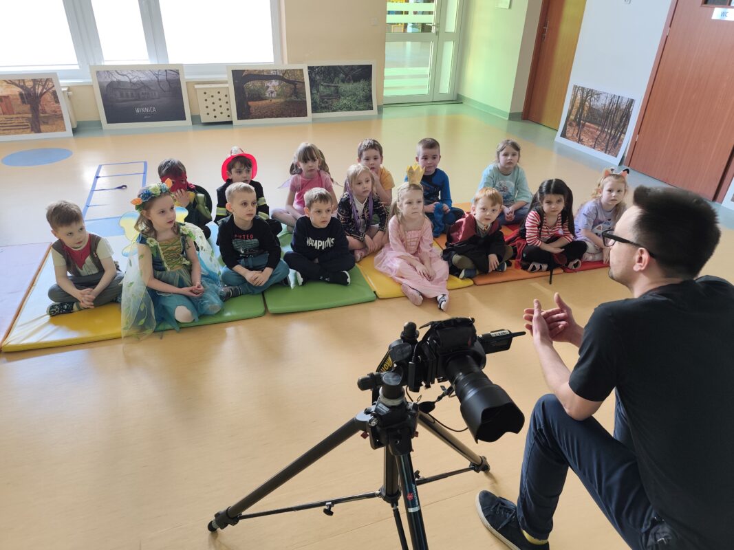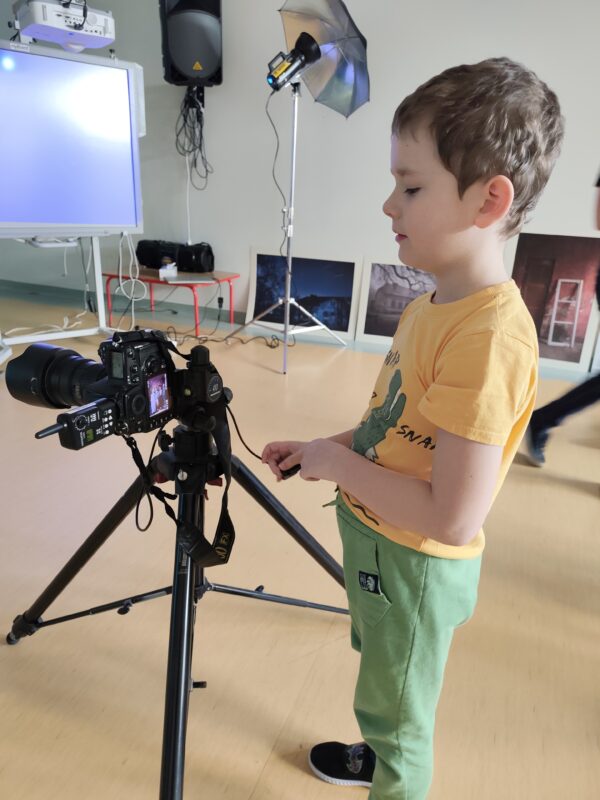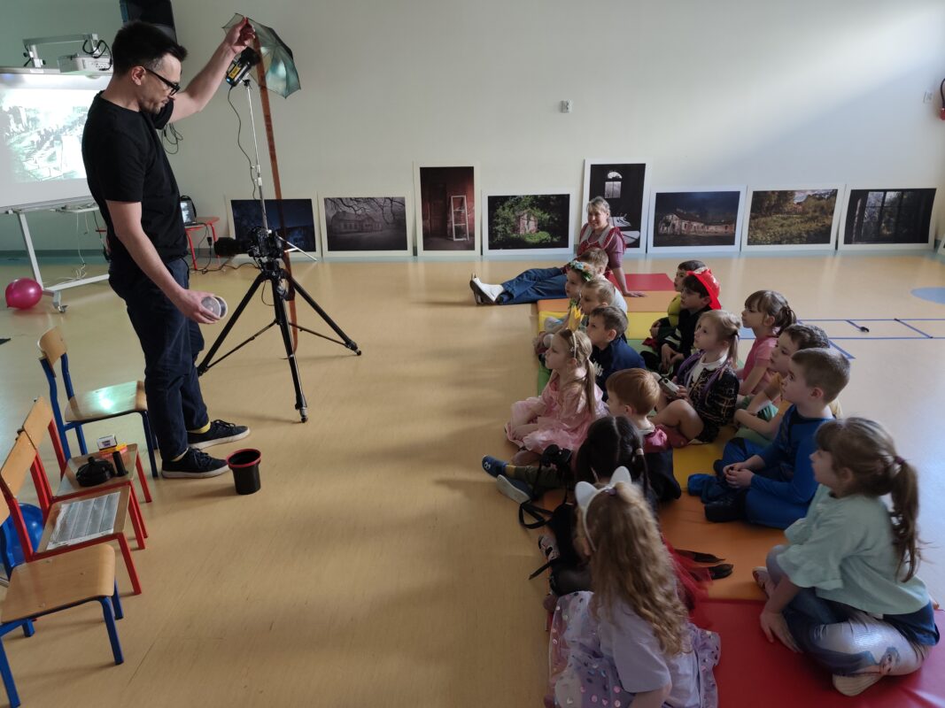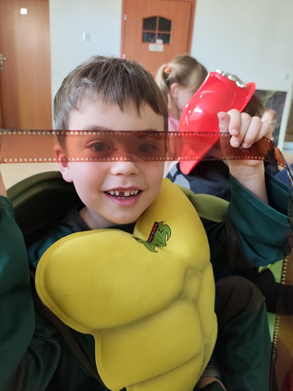 Pan pokazał nam różnego rodzaju aparaty, w tym swój ulubiony, kieszonkowy, który zawsze przy sobie. Pokazał jak wygląda klisza i wyjaśnił, iż występują one w dwóch opcjach: kolorowej i czarno-białej. Zapoznaliśmy się z wyglądem pierwszego na świecie zdjęcia zrobionego przez fotografa o nazwisku Niepce. Pan Adam opowiedział, iż jego przygoda i pasja do fotografii rozpoczęła się w wieku 12 lat. Zaprezentował swoje prace, które 3 lata temu wzięły udział w wystawie w galerii SDK.