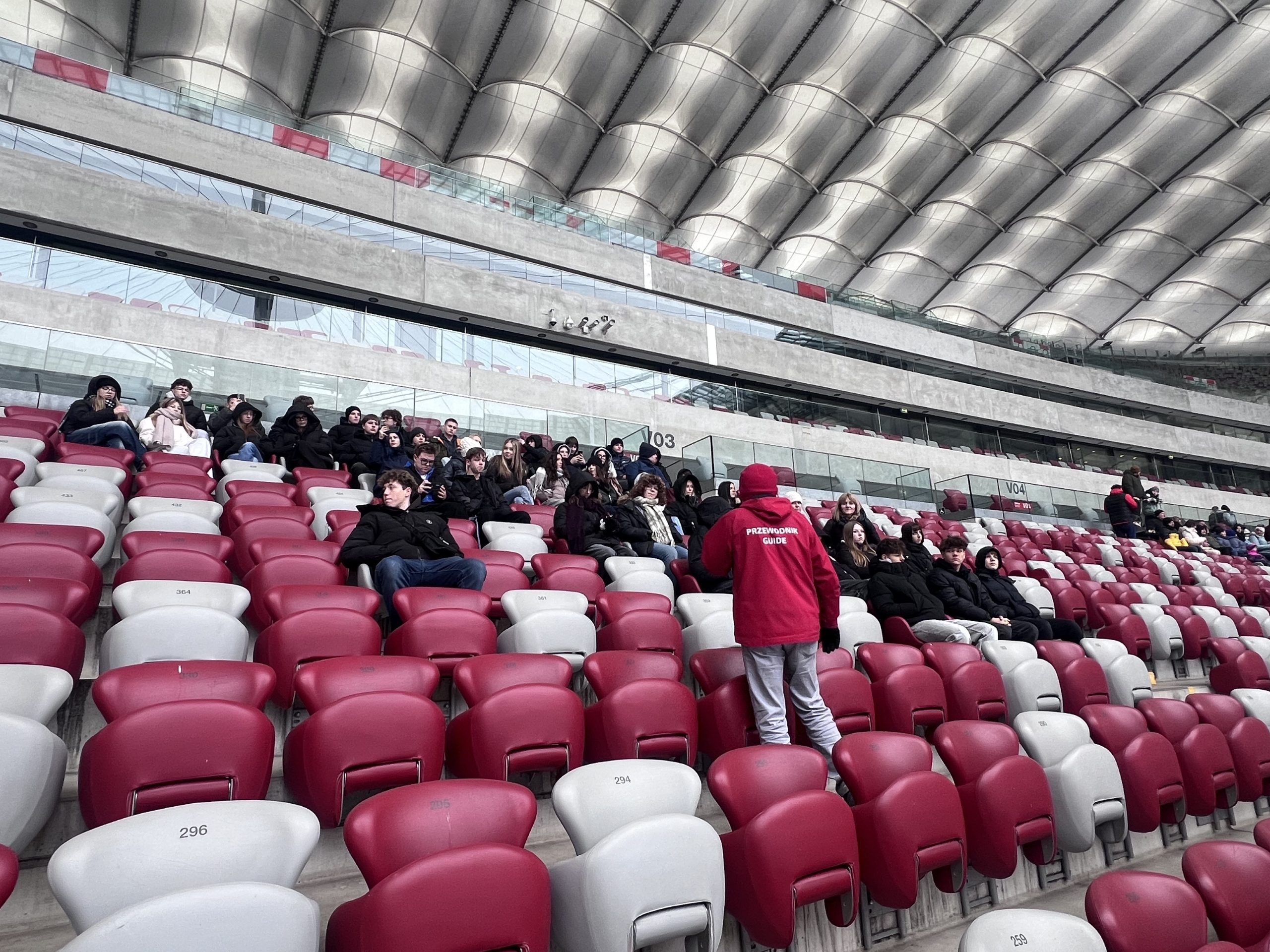 Głównym punktem programu było zwiedzanie PGE Narodowego – jednego z najnowocześniejszych i największych stadionów w Polsce. Podczas wizyty mieliśmy okazję zobaczyć trybuny, loże VIP, szatnię zawodników oraz zejść na płytę boiska. Przewodnik opowiedział nam wiele ciekawostek dotyczących budowy stadionu oraz najważniejszych wydarzeń sportowych i kulturalnych, które się tam odbyły.