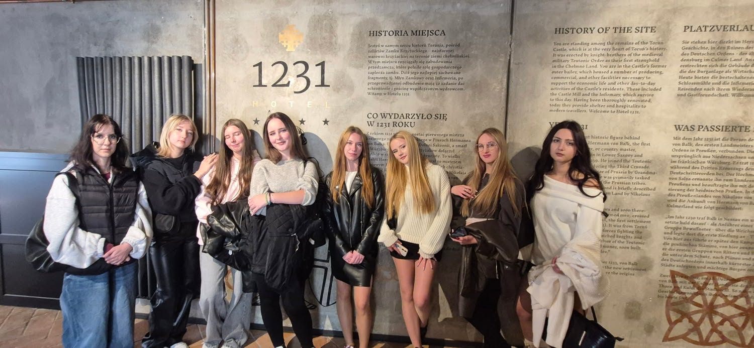 26 września 2025 r. uczniowie 2 klasy technikum hotelarskiego wzięli udział w przedmiotowej wycieczce do hotelu „1231” – czterogwiazdkowego butikowego obiektu, położonego w sercu toruńskiej Starówki. Hotel składa się z 2 budynków połączonych ze sobą podziemnym korytarzem. Pierwszy mieści się w odrestaurowanym XIII-wiecznym Młynie Zamkowym. Oba obiekty położone są na terenie ruin dawnego Zamku Krzyżackiego.