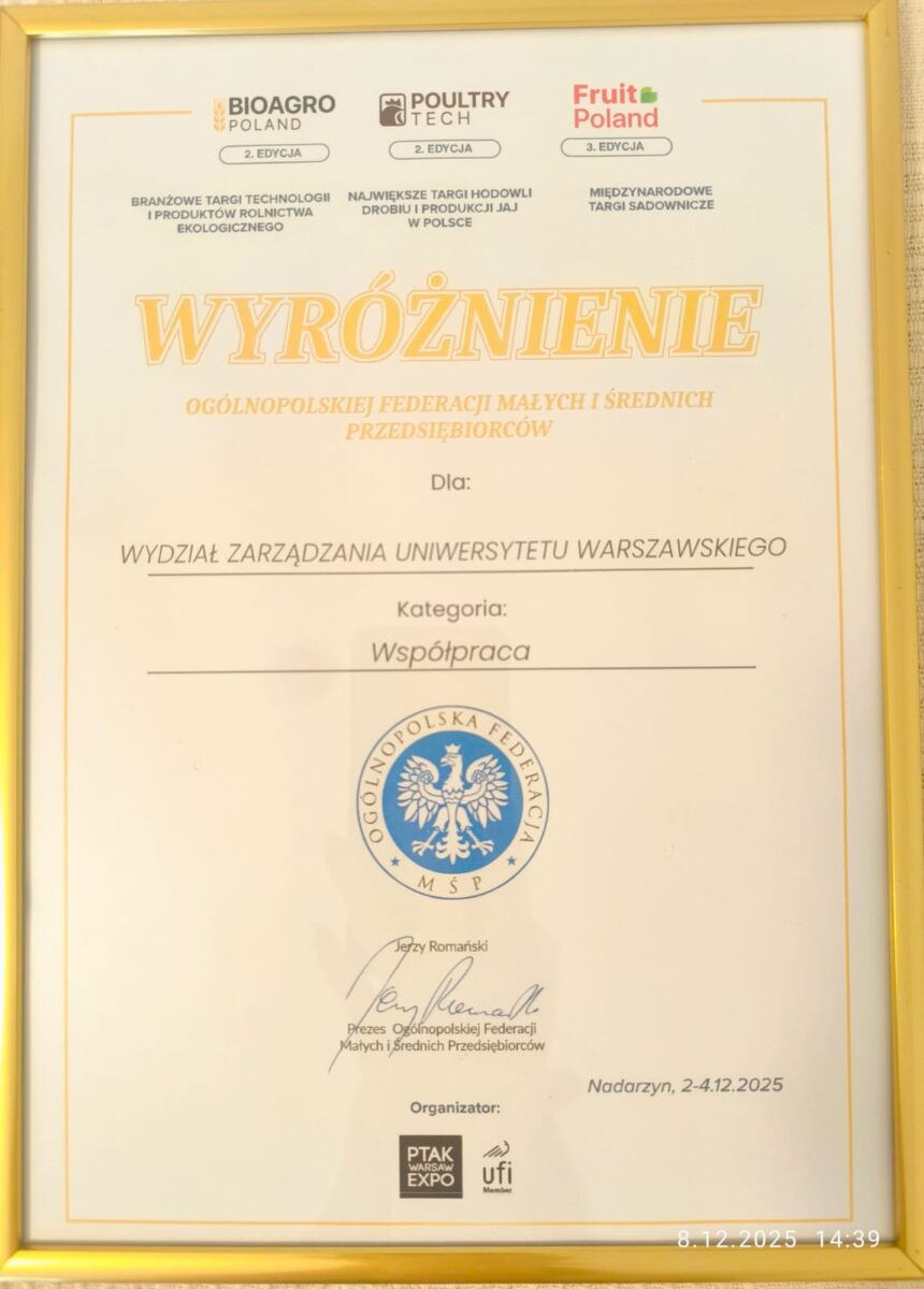 Wydział Zarządzania Uniwersytetu Warszawskiego z przyjemnością informuje o dwóch prestiżowych wyróżnieniach otrzymanych podczas targów BIOAGRO Polska, PoultryTech oraz Fruit Poland, które odbyły się w Ptak Warsaw Expo.