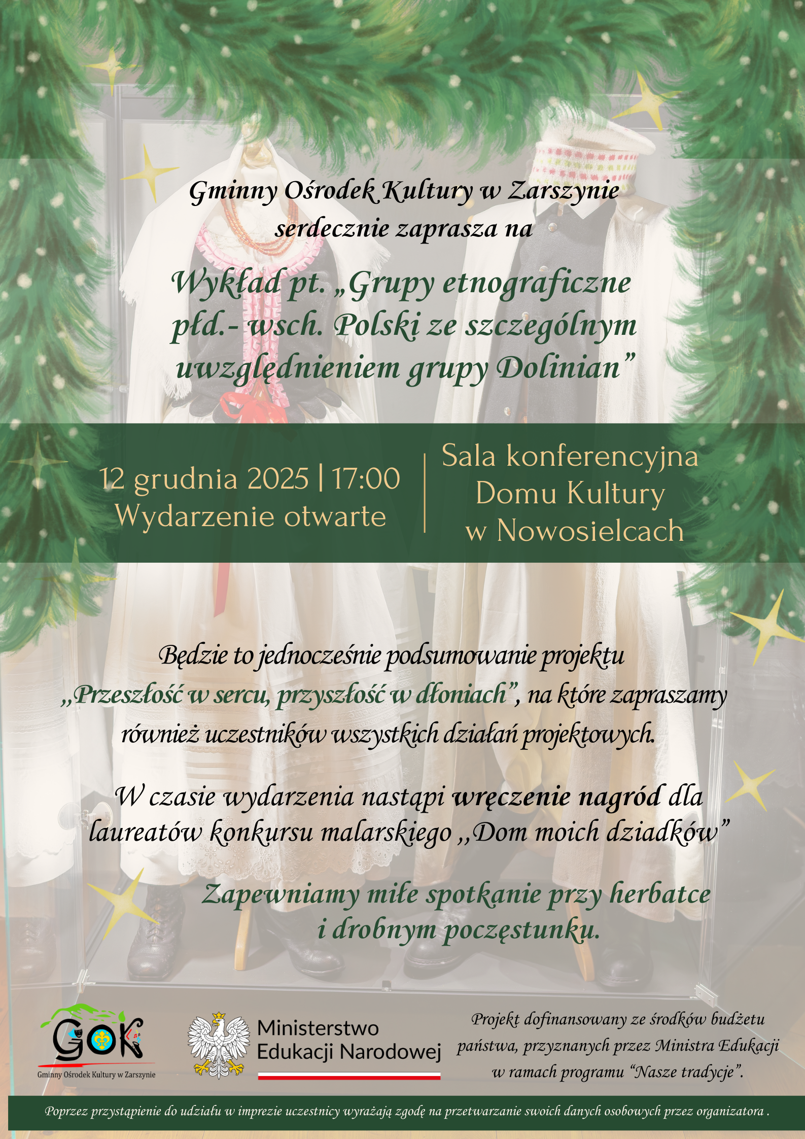 Gminny Ośrodek Kultury w Zarszynie zaprasza wszystkich miłośników historii i regionalnego dziedzictwa na otwarty wykład pt. „Grupy etnograficzne płd.-wsch. Polski ze szczególnym uwzględnieniem grupy Dolinian”. Wydarzenie, które odbędzie się 12 grudnia, będzie jednocześnie uroczystym podsumowaniem projektu „Przeszłość w sercu, przyszłość w dłoniach”.