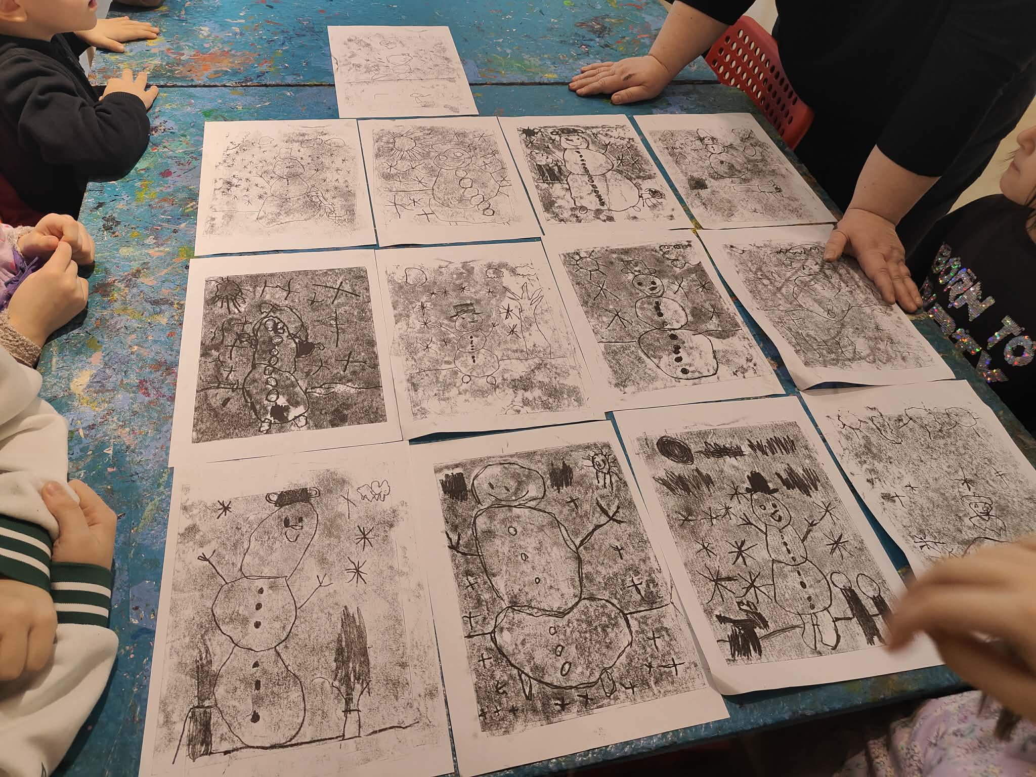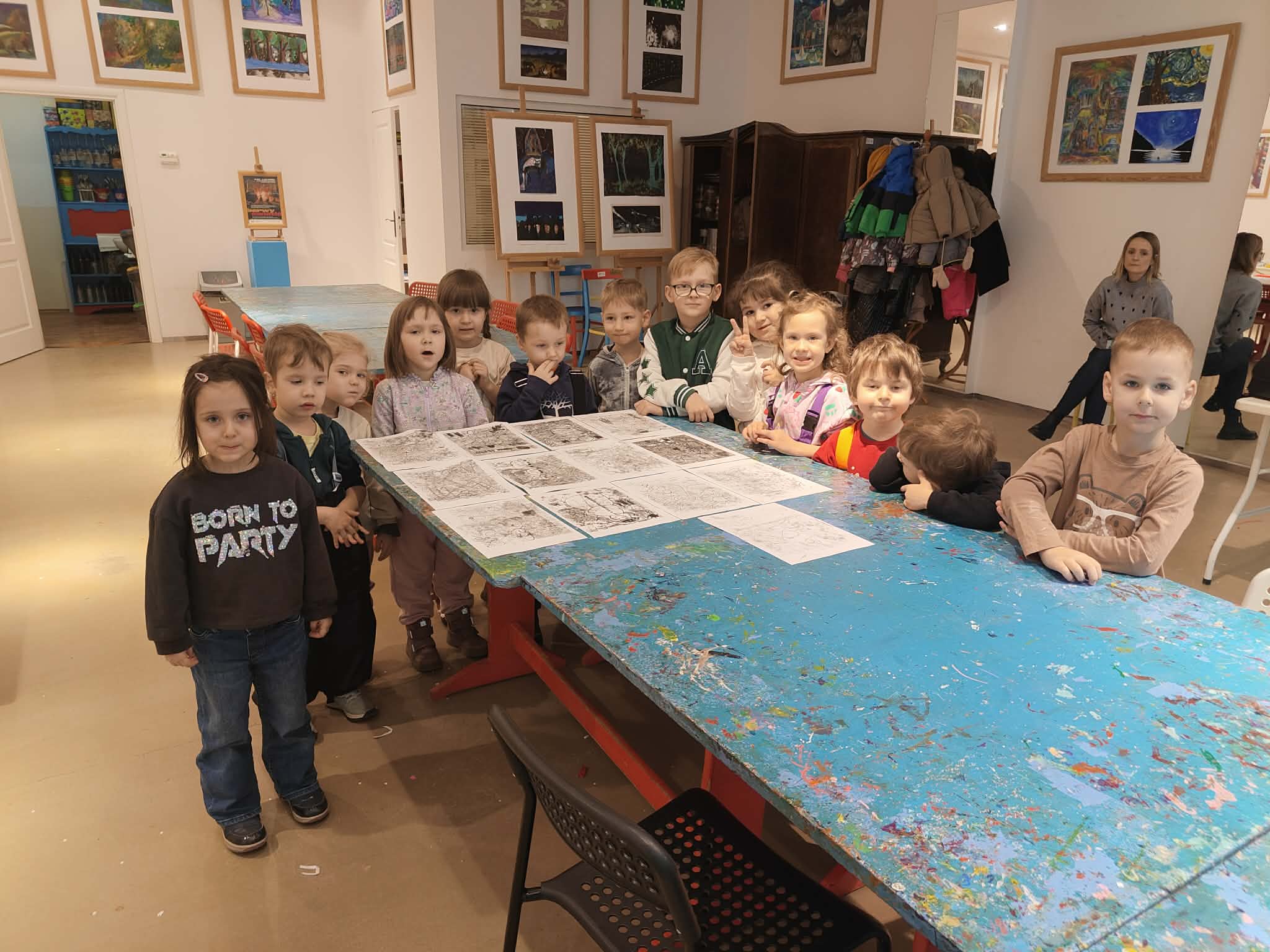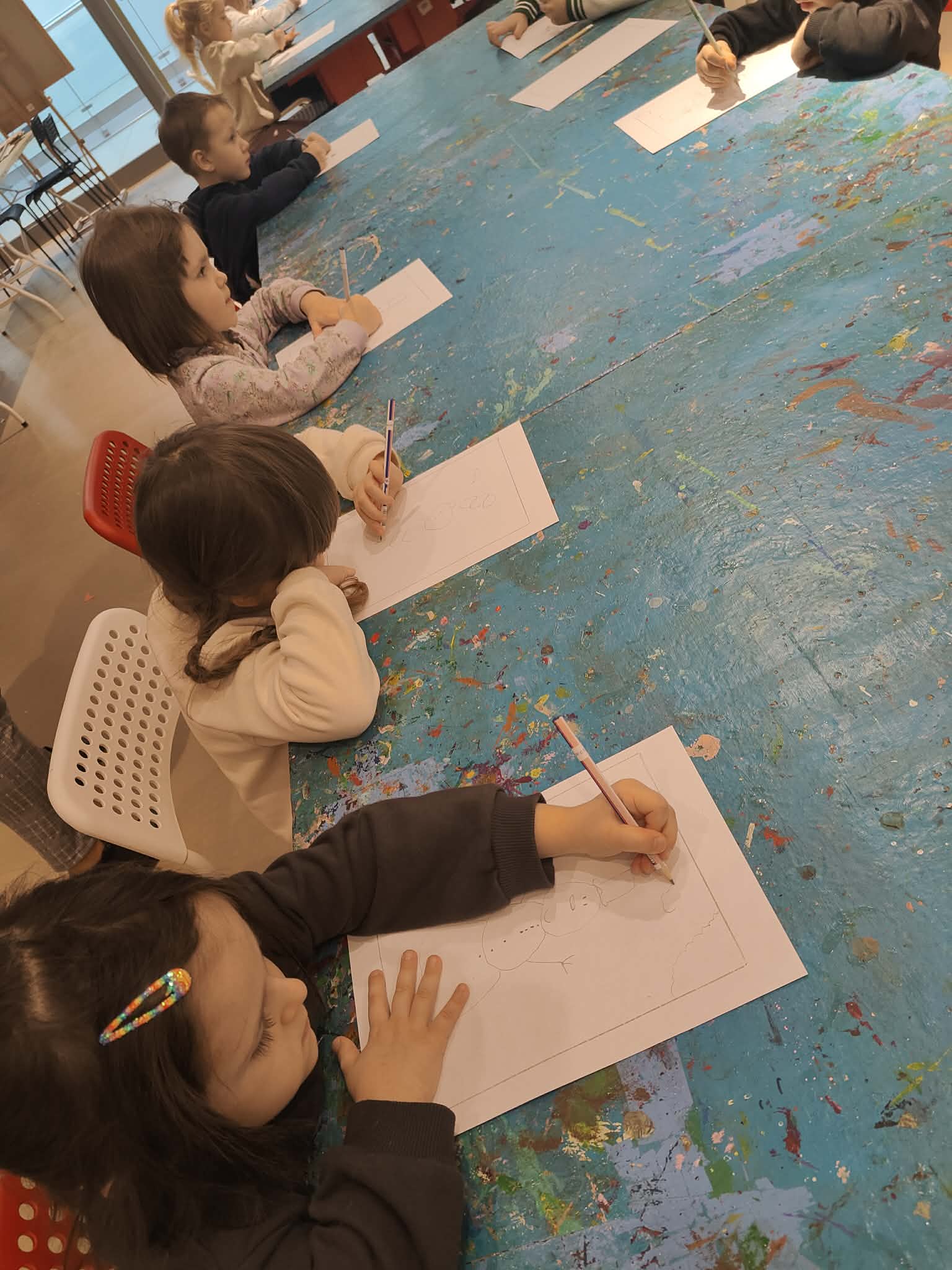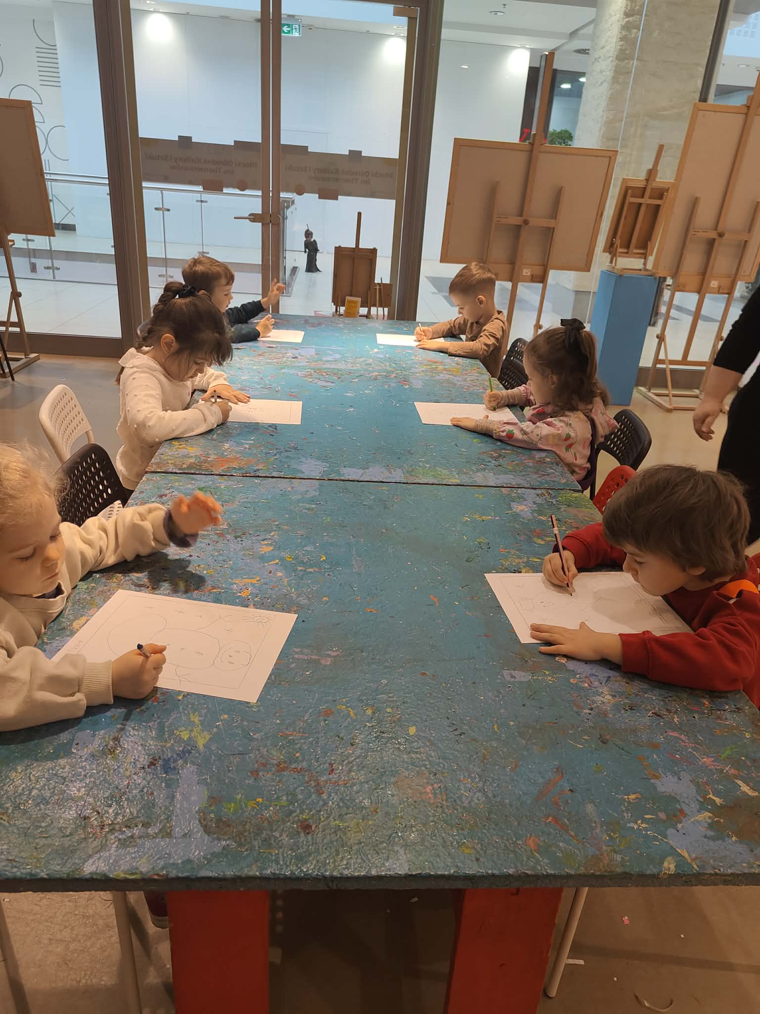 9 lutego dzieci z grupy Biedronki wybrały się do Pracowni Działań Twórczych „Kolor i Forma” w Galerii Wisła na warsztaty „Zimowe kolory i kształty”. Na początku spotkania Pani prowadząca serdecznie przywitała dzieci oraz zaprezentowała galerię obrazów wykonanych przez dzieci z różnych krajów. Następnie wytłumaczyła krok po kroku, jakie działania będą realizowane podczas warsztatów. W trakcie zajęć przedszkolaki najpierw narysowały ołówkiem zimowy pejzaż, a następnie tworzyły monotypię – technikę polegającą na pokryciu farbą szklanej matrycy i odbiciu jej na kartce papieru dzięki wałka. Dzięki tej metodzie powstały piękne, zimowe prace plastyczne. Dzieci wróciły do przedszkola bardzo zadowolone i pełne artystycznych wrażeń